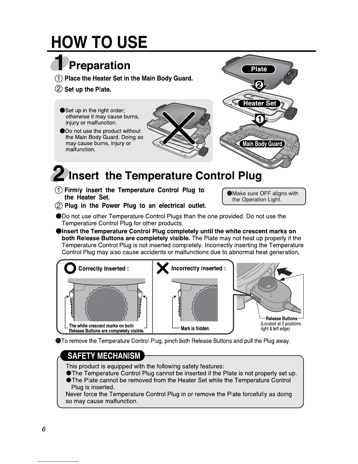 Zojirushi EA-DCC10 - How to Use; Preparation; Insert the Temperature Control Plug; Safety Mechanism