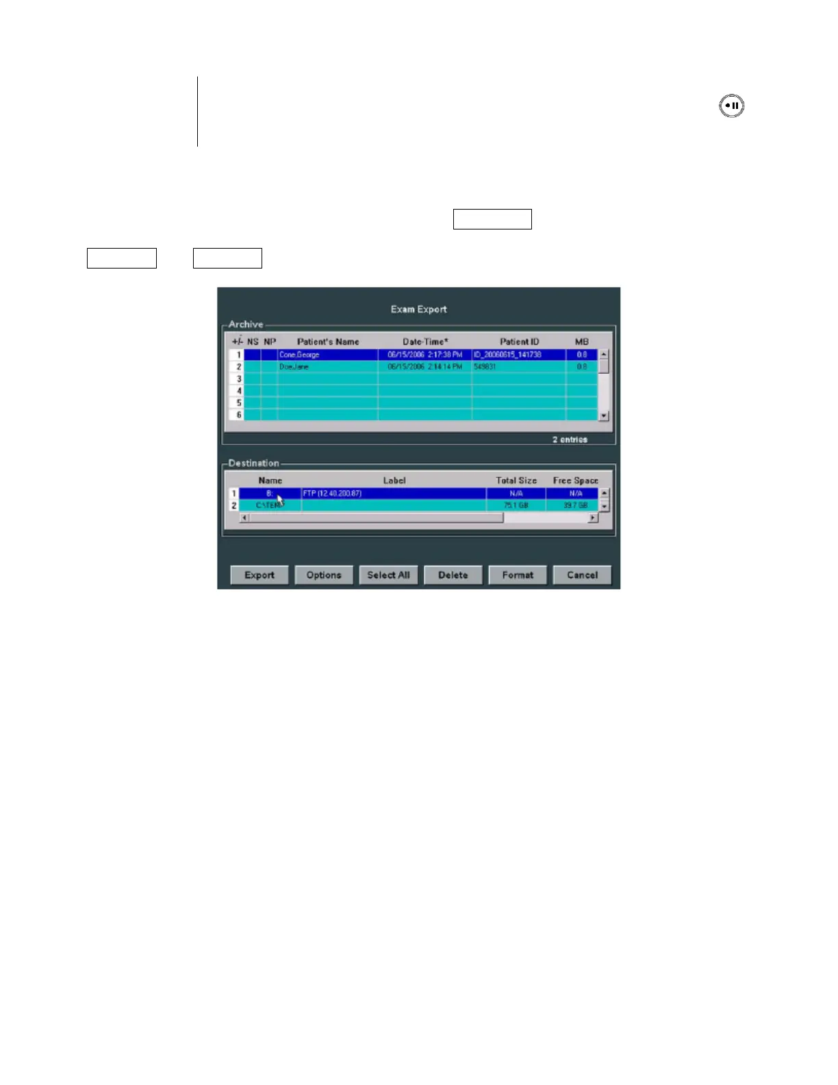 then selected as the target device; the desired exam(s) is highlighted in the Archive menu, and the