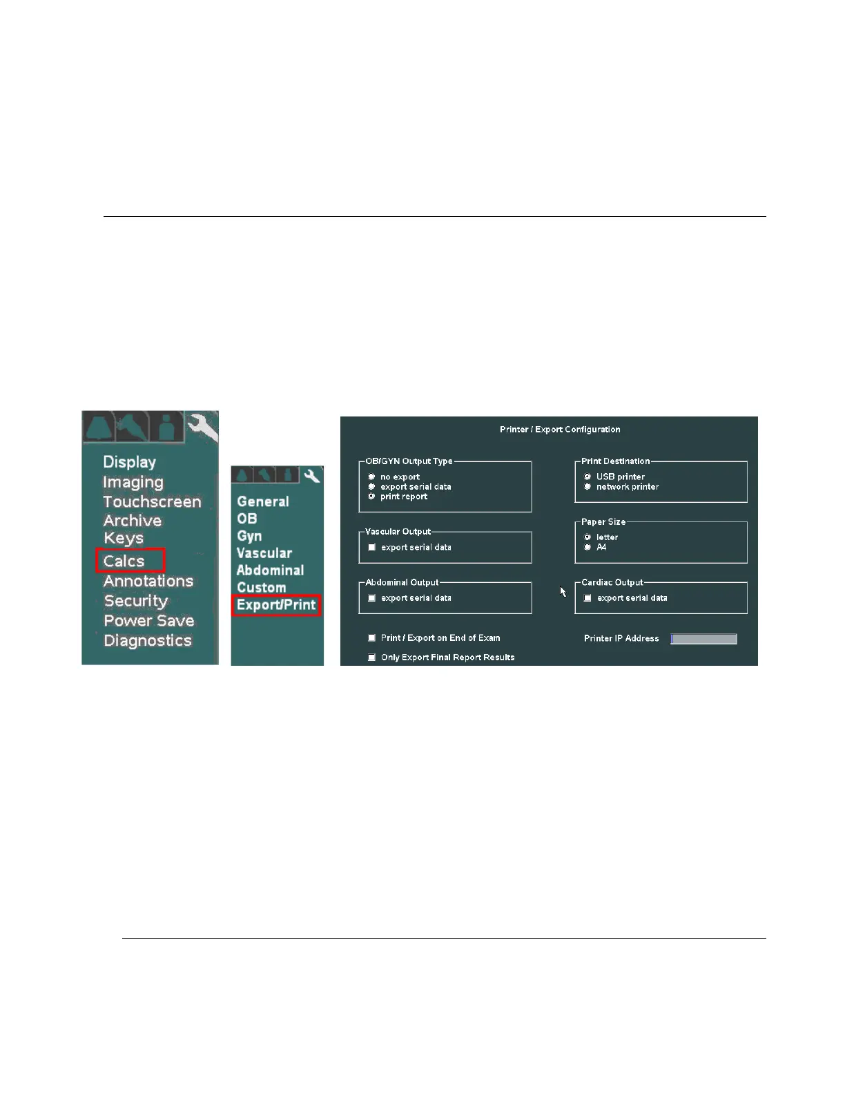 2. To configure the system for printing of the desired type (OB, Vascular) reports to the HP