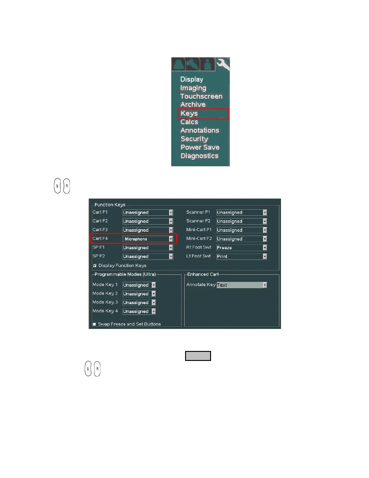 1. Using the trackball scroll down to backlight the Keys selection, and press one of the SET keys