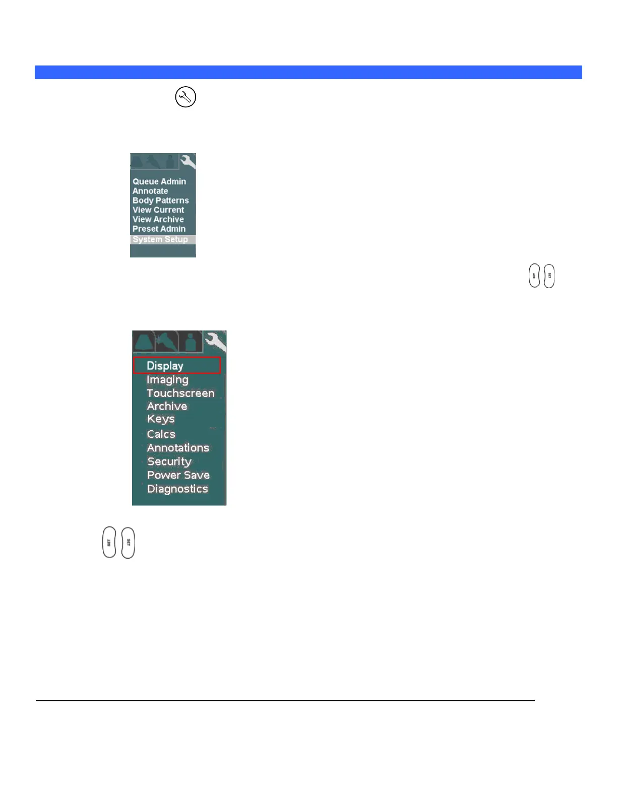 2. Using the trackball to backlight SYSTEM SETUP selection, and press one of the SET keys to