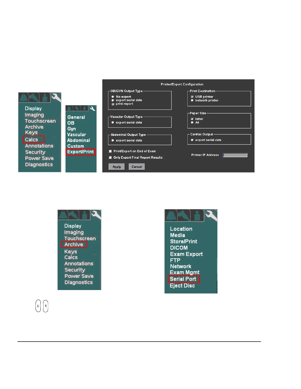 The three (3) types of Calc report data that can be exported, via the USB ports, are as listed below. Configuring