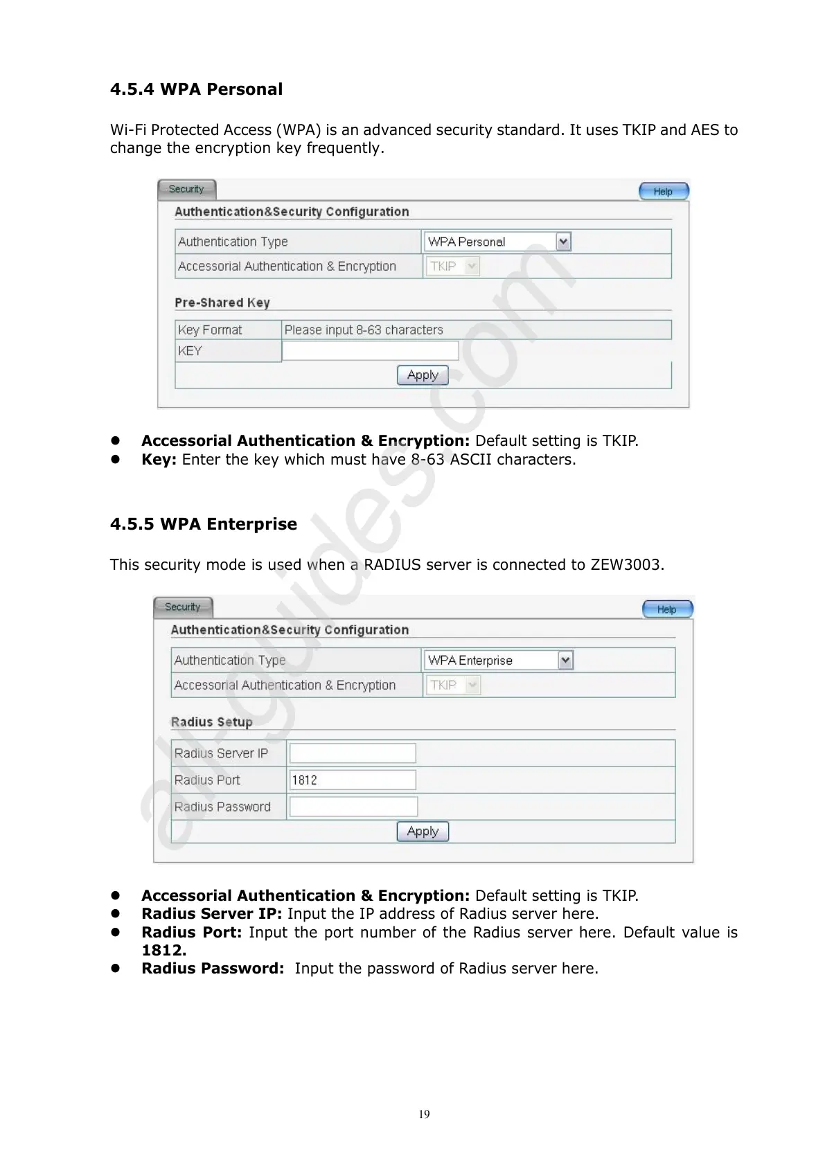 Accessorial Authentication & Encryption: Default setting is TKIP.