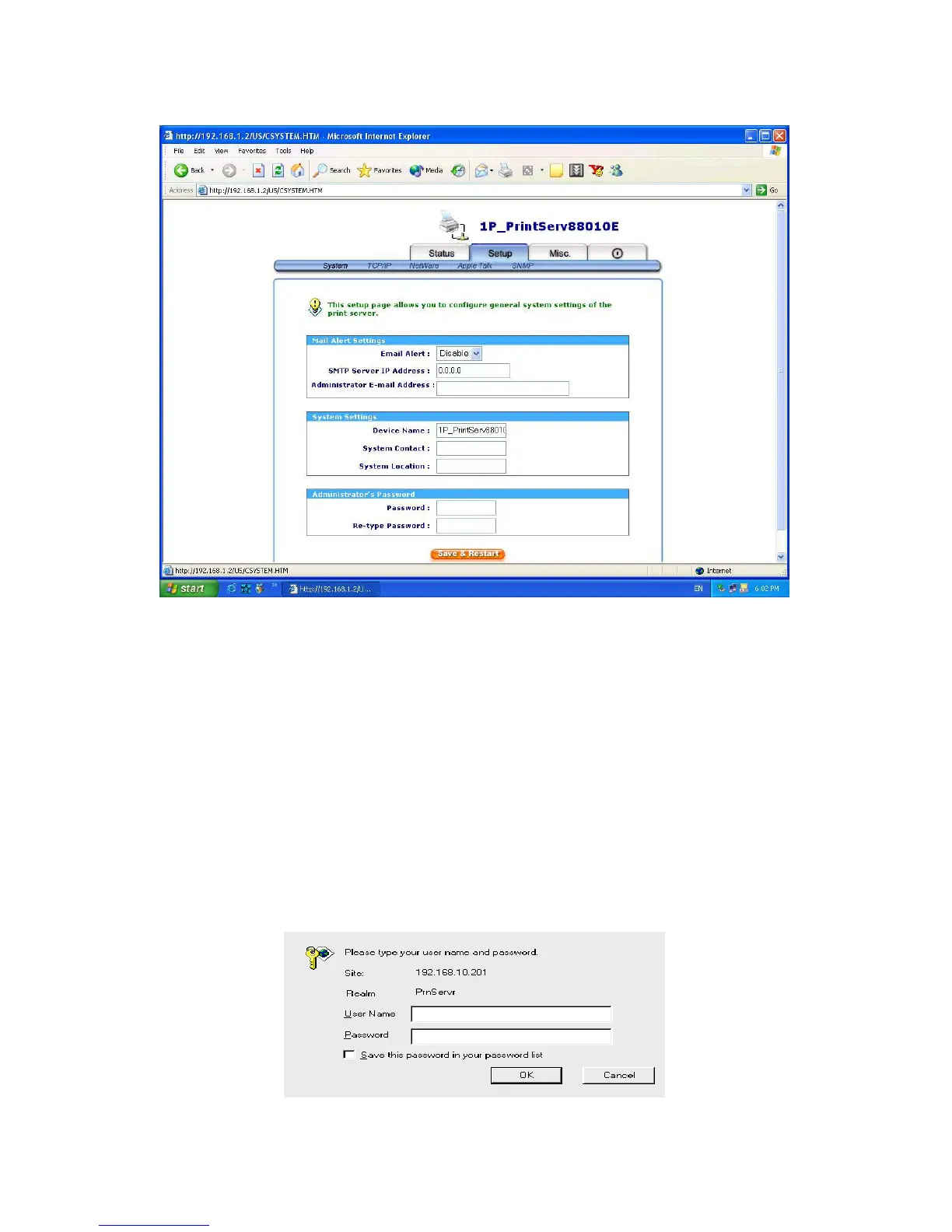 select setup menu of web configuration from the print server, it then as shown in
