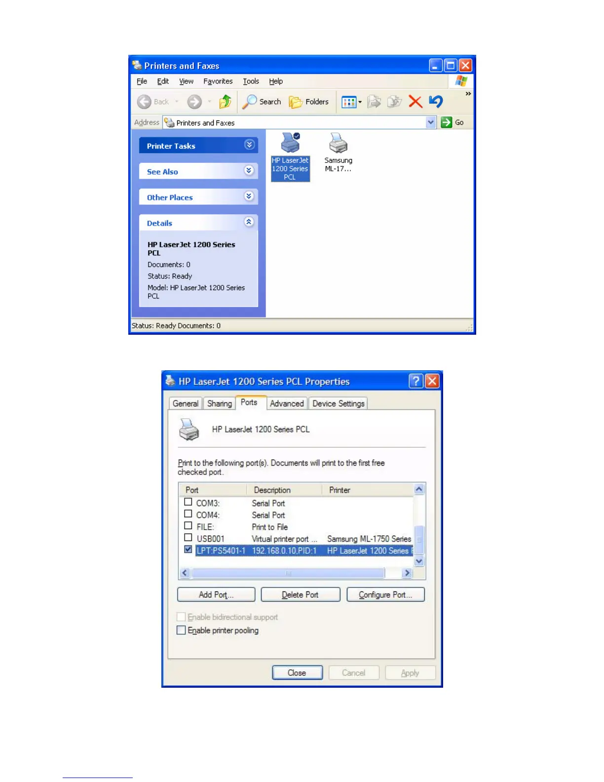 16. Right-click, select Properties -> Ports and verify that the print server’s port appears.
