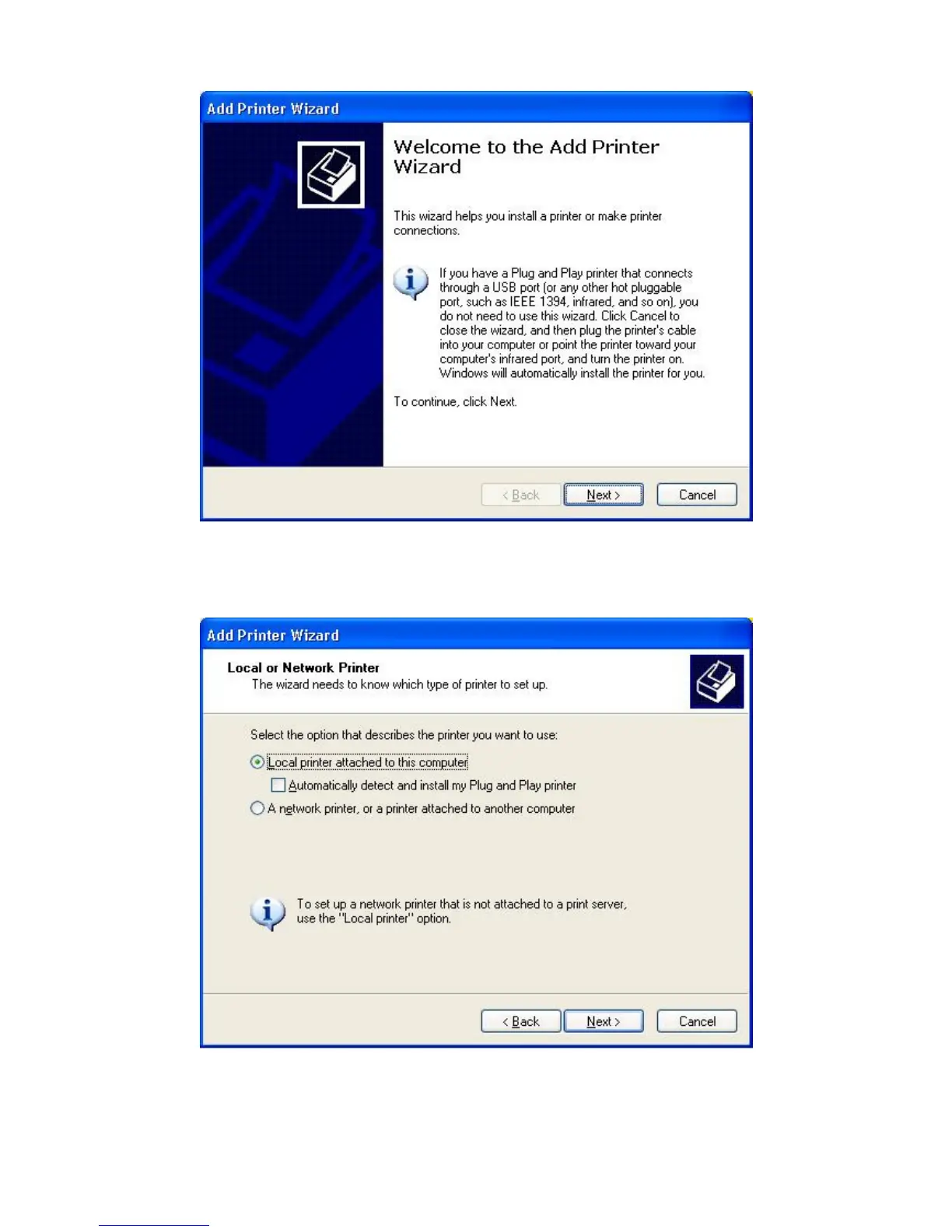 9. Click Next and select Local Printer, make sure the Automatically detect and
