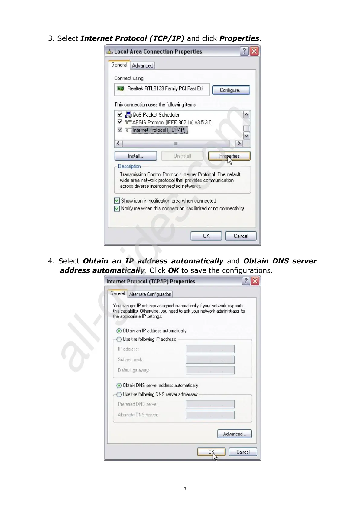 4. Select Obtain an IP address automatically and Obtain DNS server