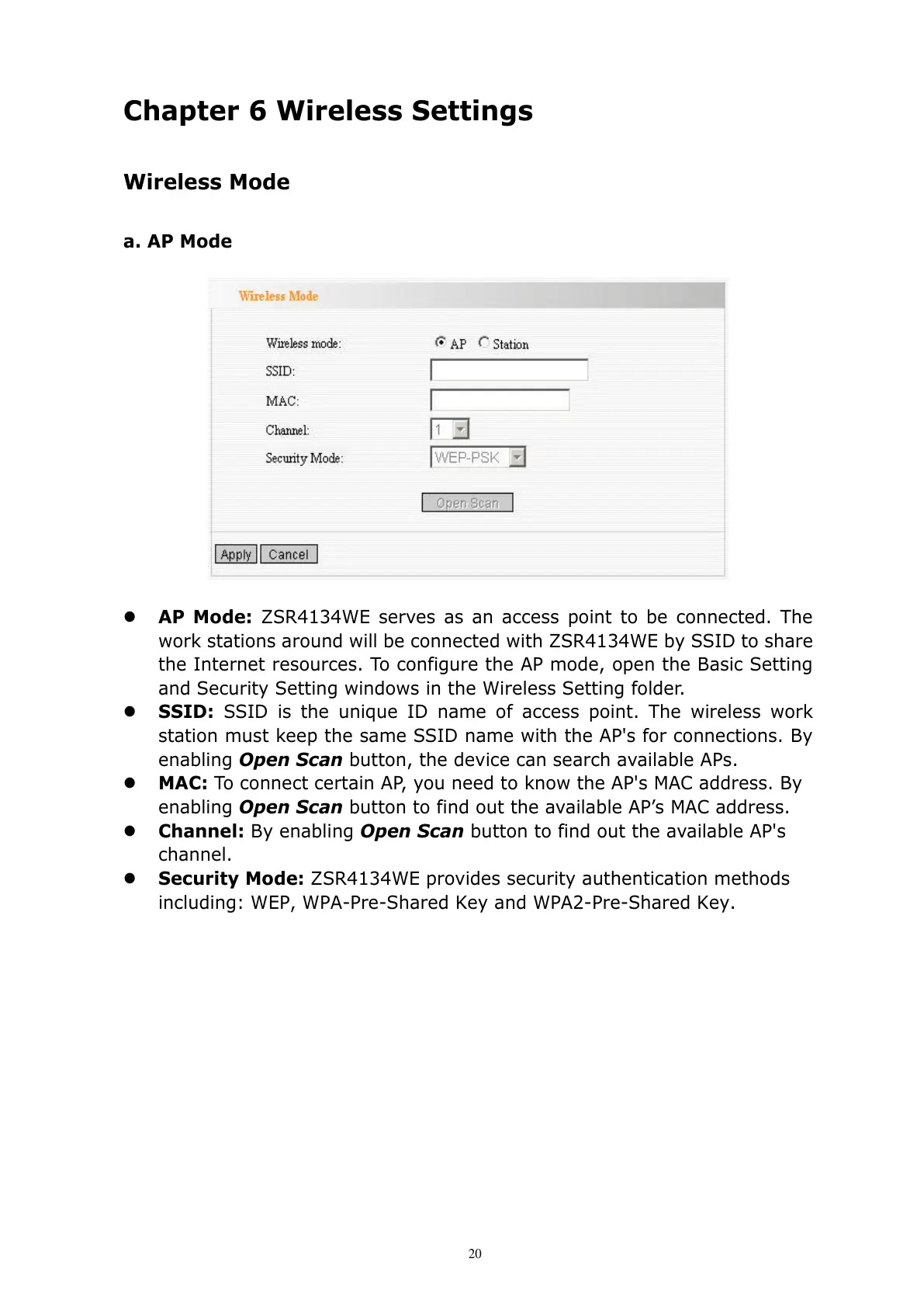 AP Mode: ZSR4134WE serves as an access point to be connected. The