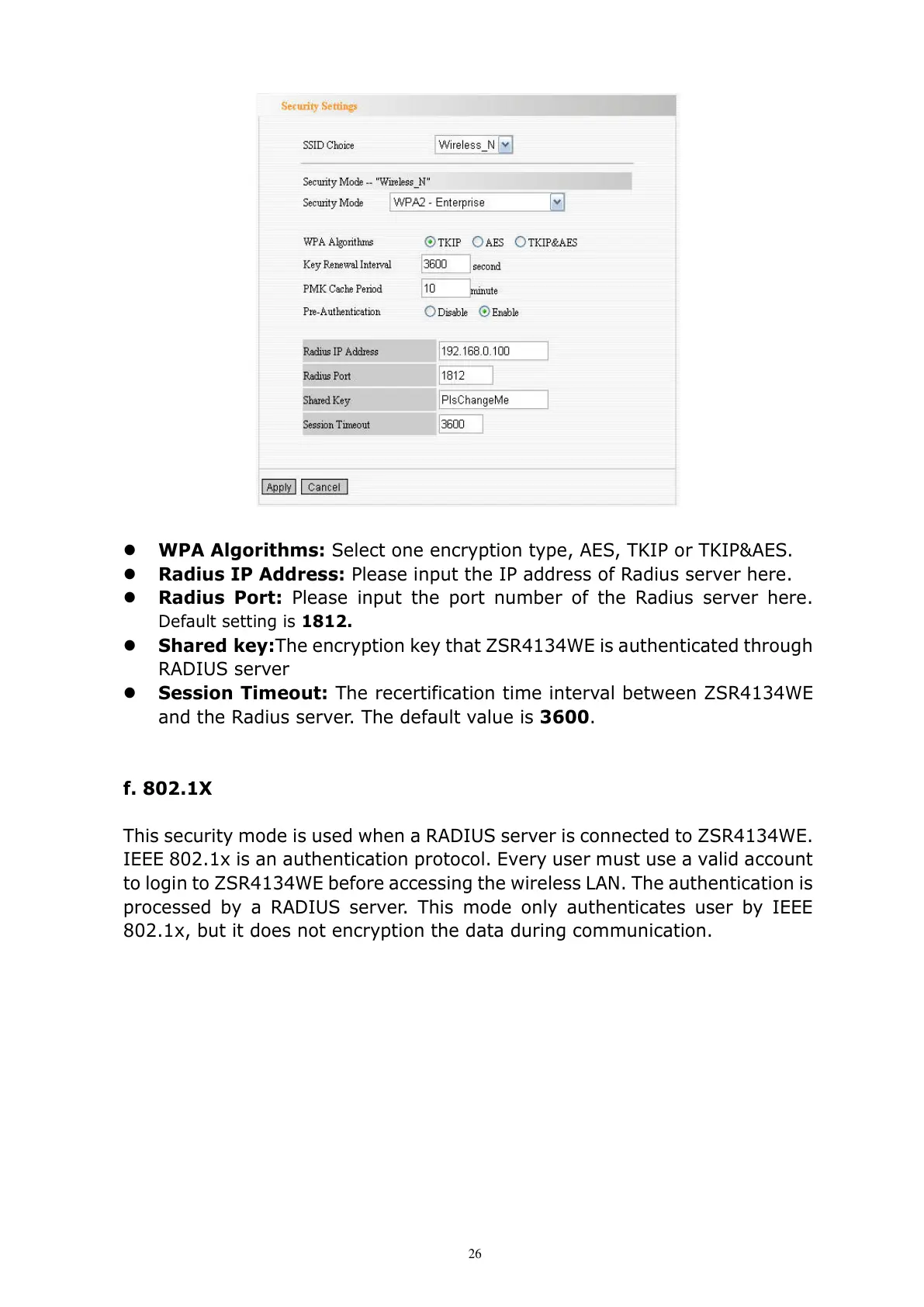 This security mode is used when a RADIUS server is connected to ZSR4134WE.