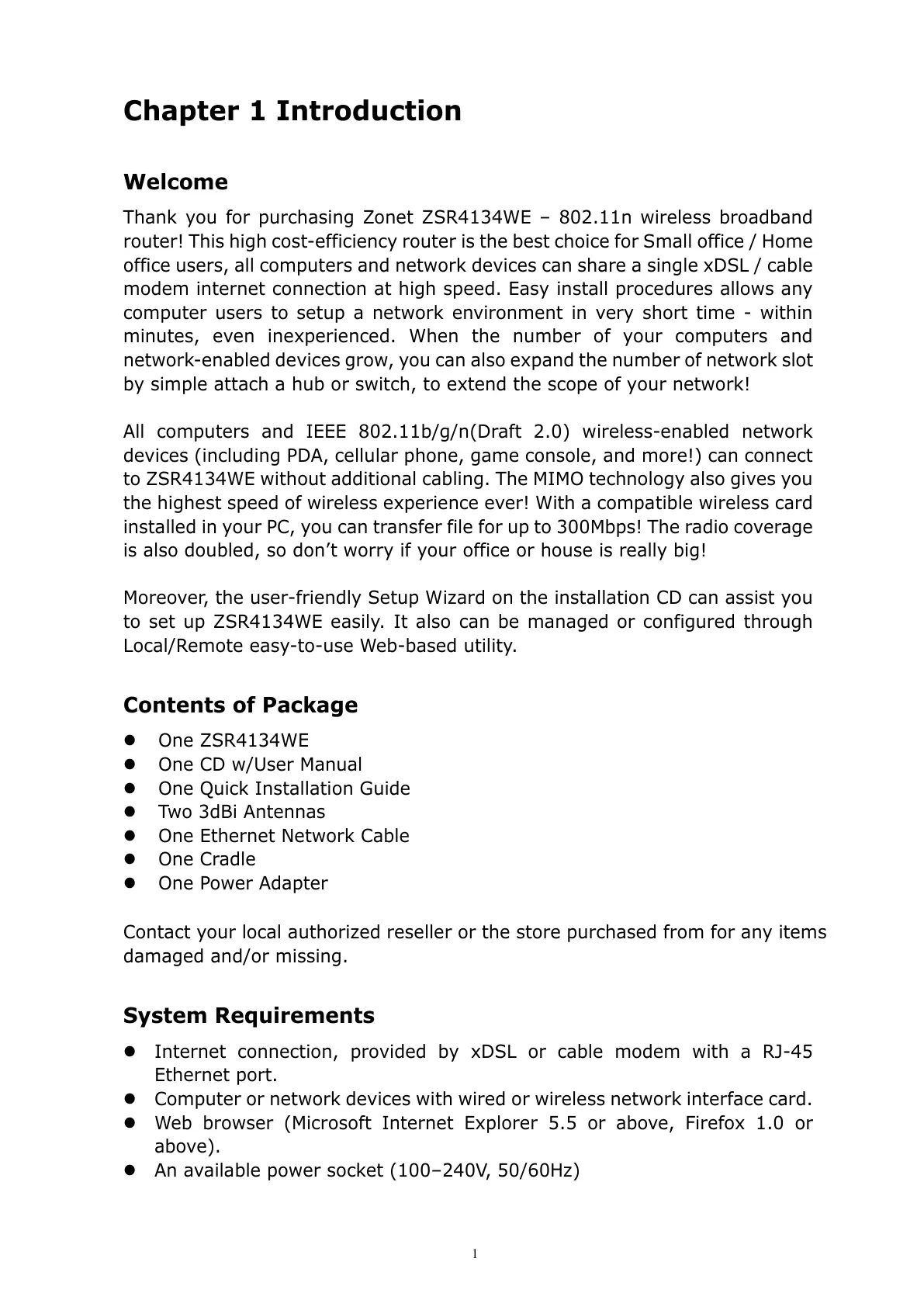 Thank you for purchasing Zonet ZSR4134WE – 802.11n wireless broadband