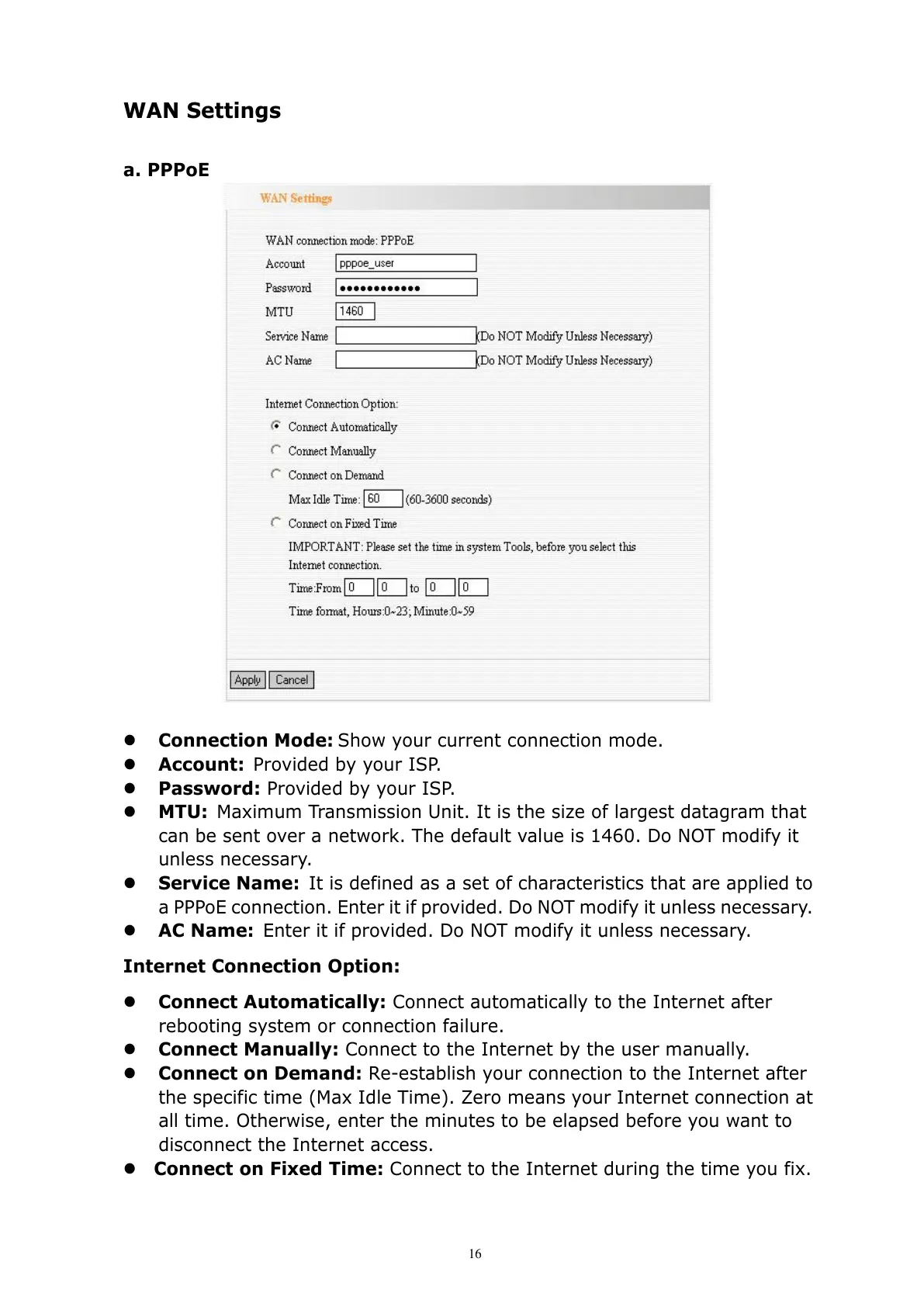 Connect Manually: Connect to the Internet by the user manually.