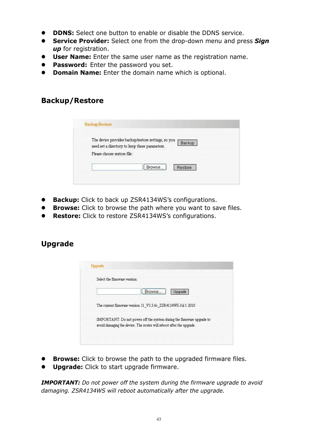 Backup: Click to back up ZSR4134WS’s configurations.
