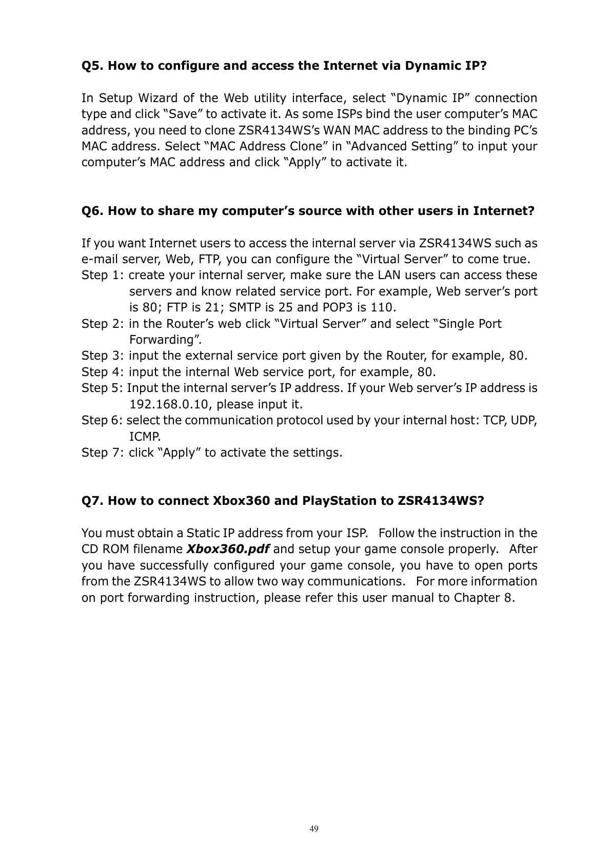 address, you need to clone ZSR4134WS’s WAN MAC address to the binding PC’s