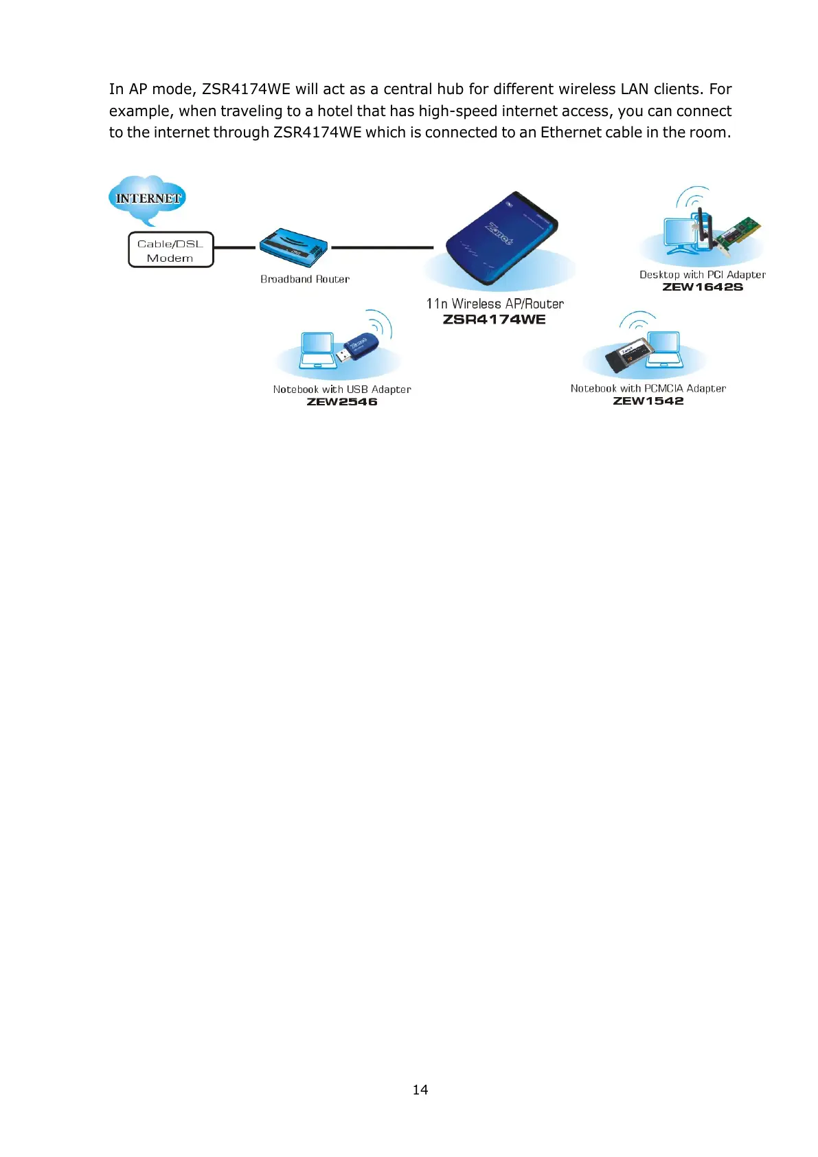 In AP mode, ZSR4174WE will act as a central hub for different wireless LAN clients. For