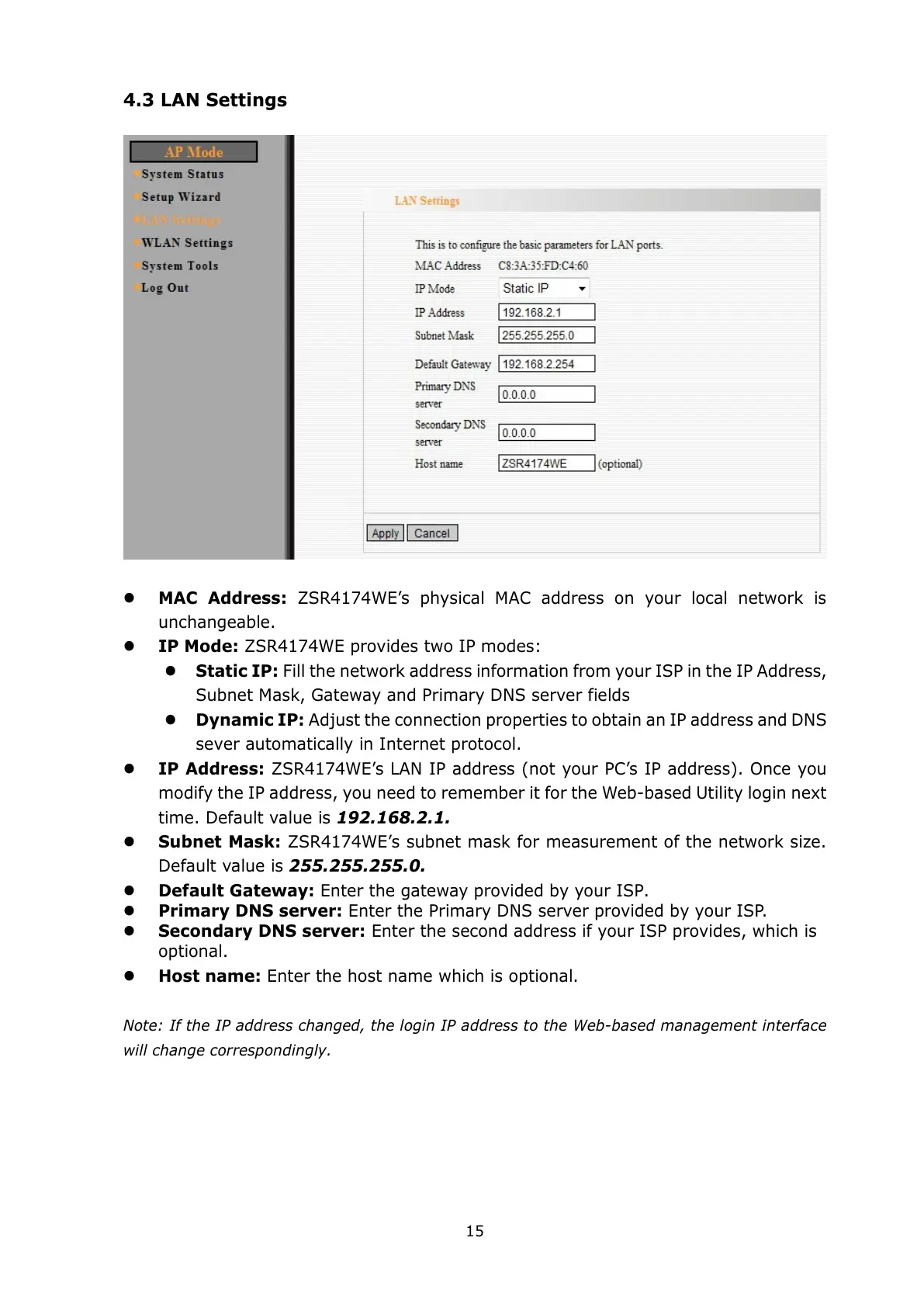 IP Address: ZSR4174WE’s LAN IP address (not your PC’s IP address). Once you