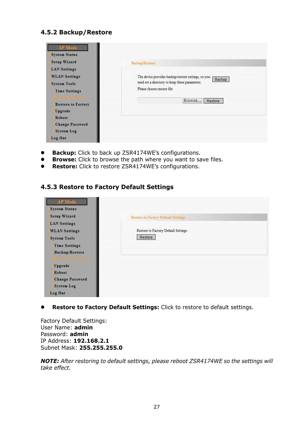 NOTE: After restoring to default settings, please reboot ZSR4174WE so the settings will
