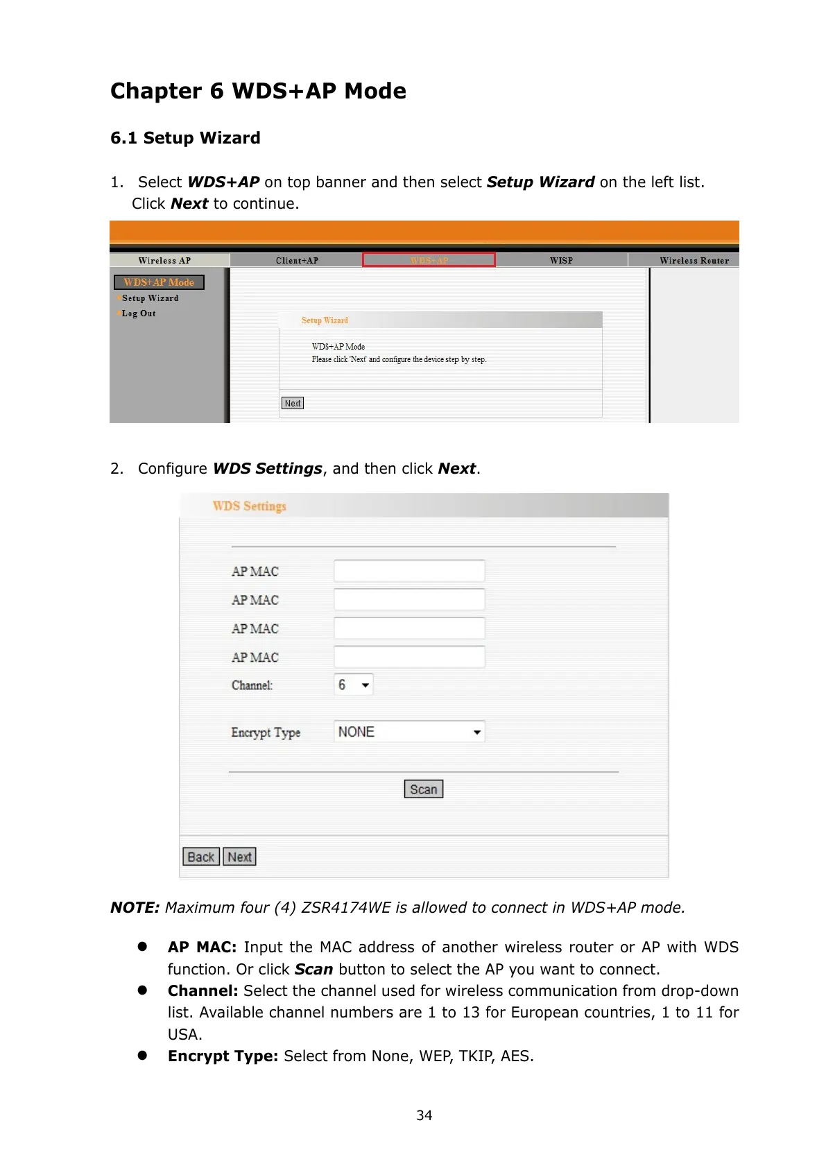 NOTE: Maximum four (4) ZSR4174WE is allowed to connect in WDS+AP mode.