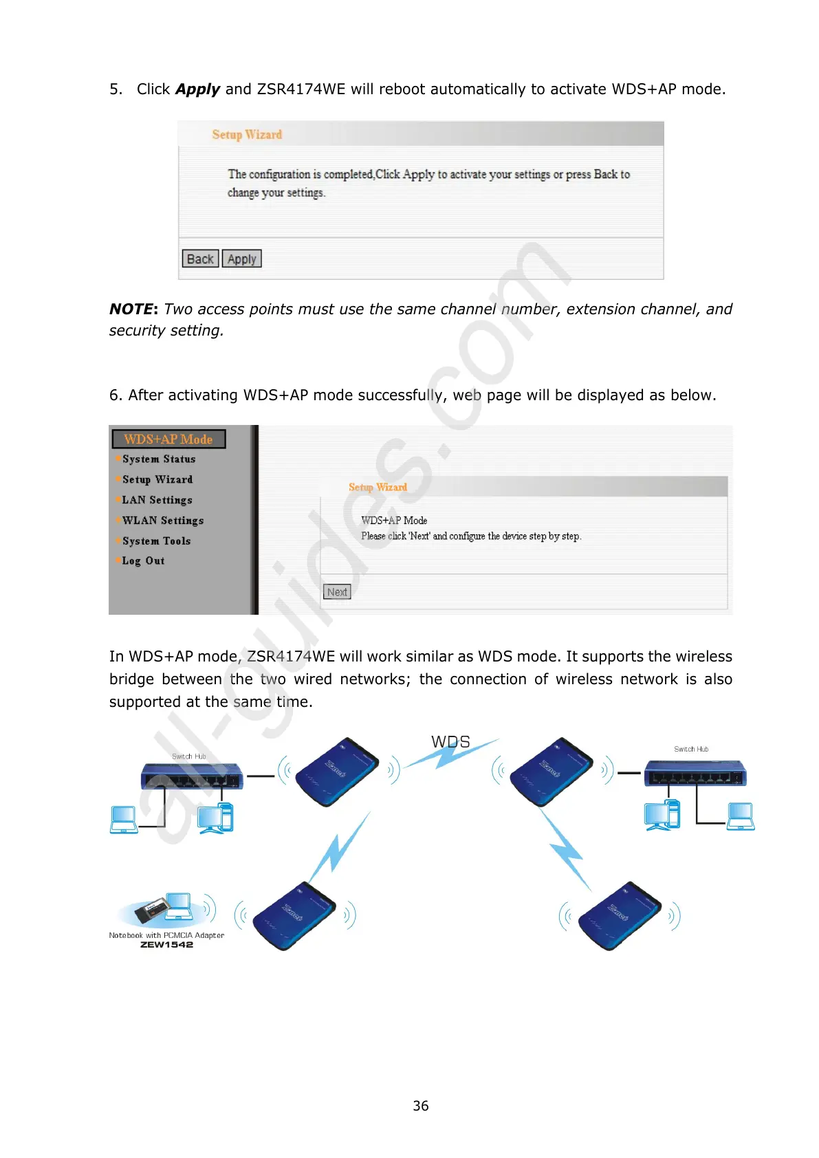 In WDS+AP mode, ZSR4174WE will work similar as WDS mode. It supports the wireless