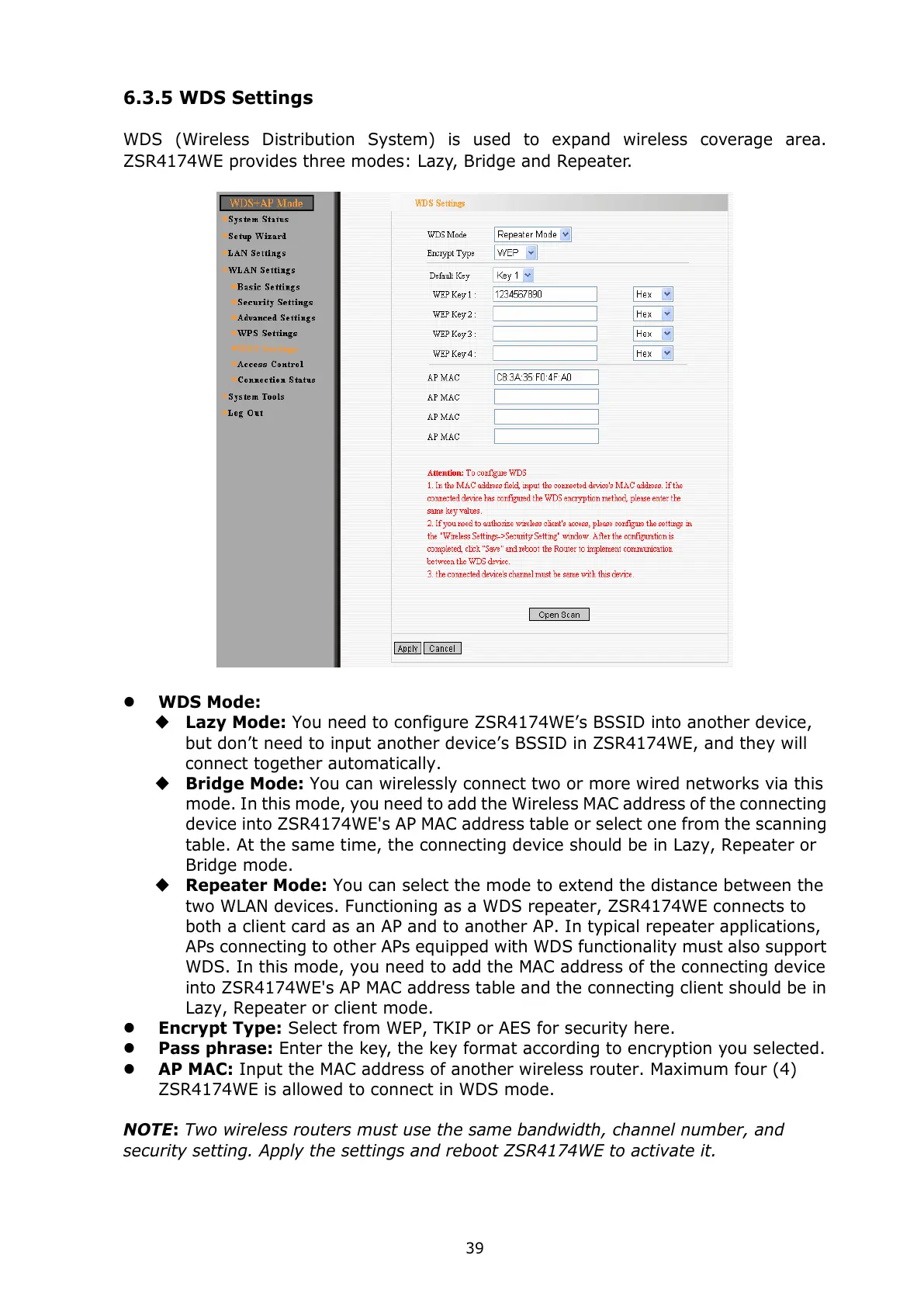 ZSR4174WE provides three modes: Lazy, Bridge and Repeater.