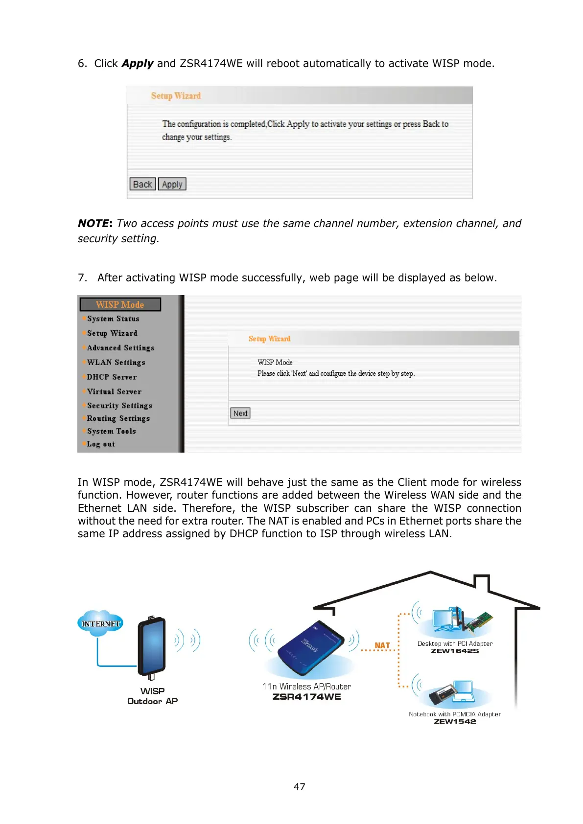 In WISP mode, ZSR4174WE will behave just the same as the Client mode for wireless