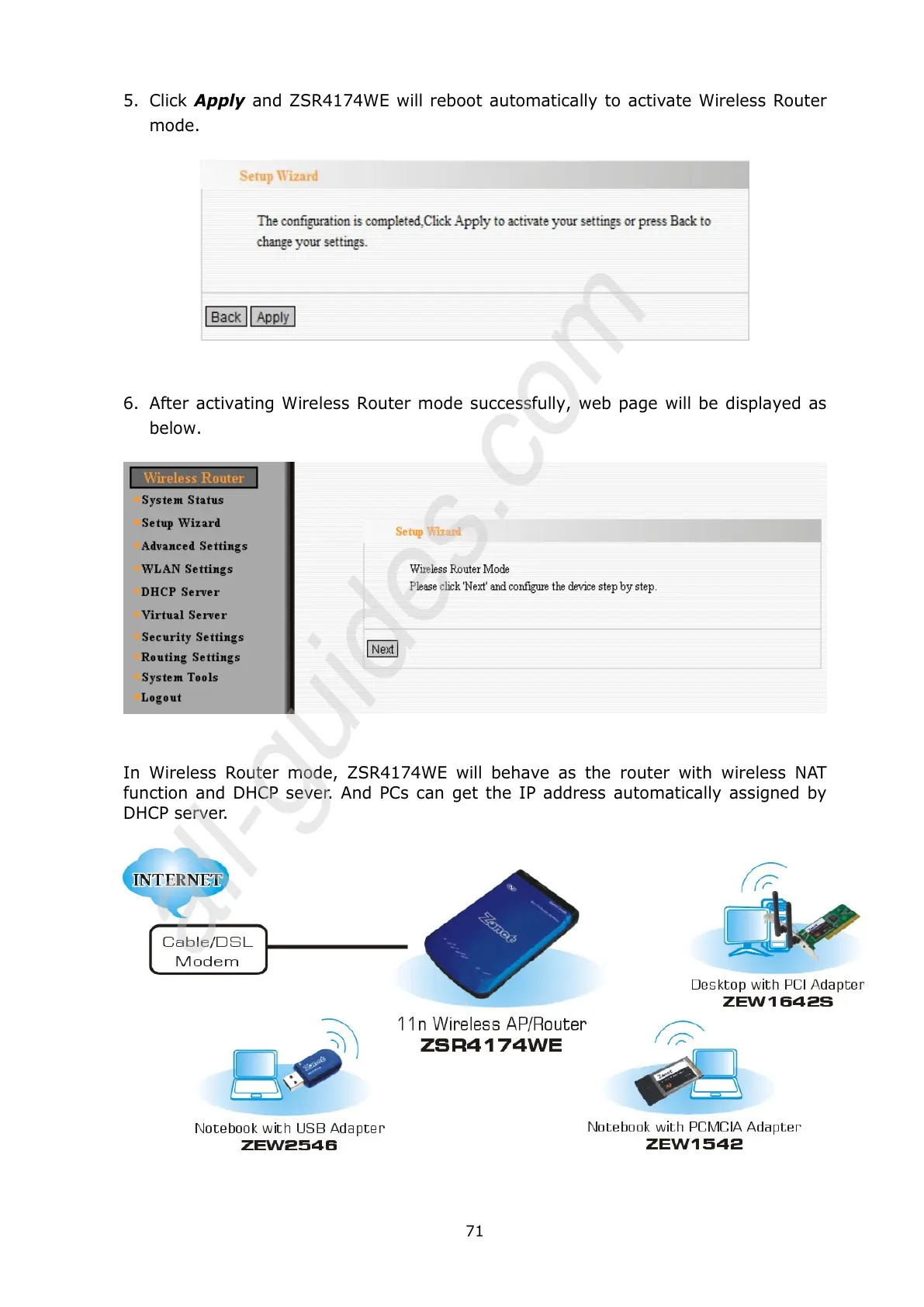 5. Click Apply and ZSR4174WE will reboot automatically to activate Wireless Router