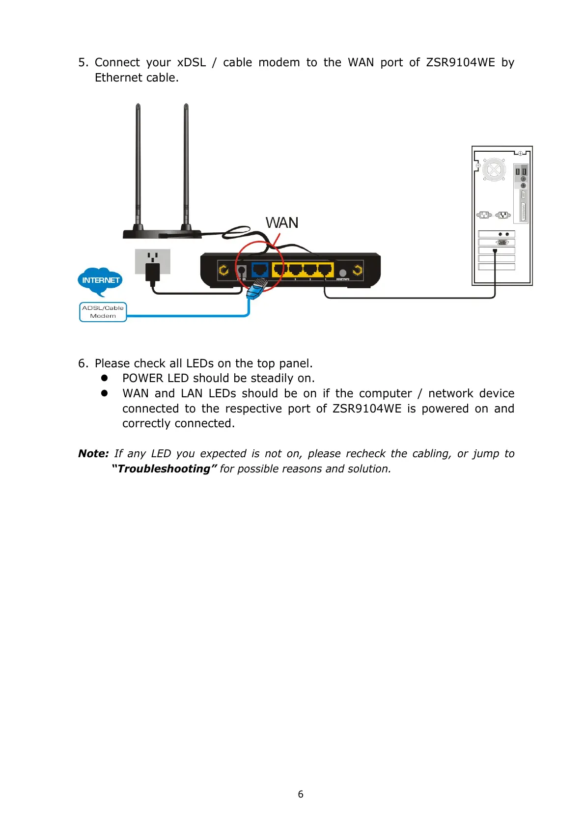 5. Connect your xDSL / cable modem to the WAN port of ZSR9104WE by