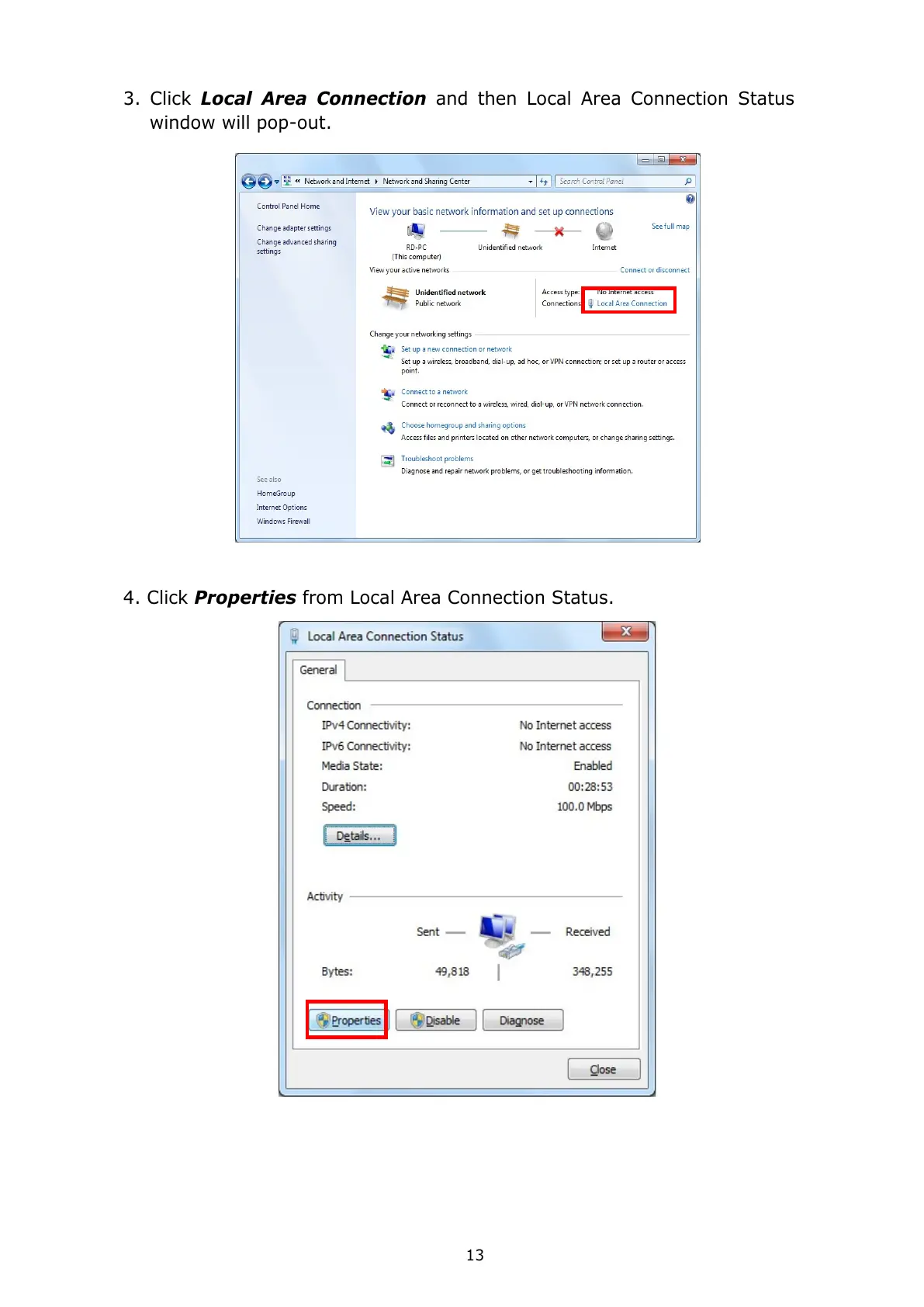 3. Click Local Area Connection and then Local Area Connection Status