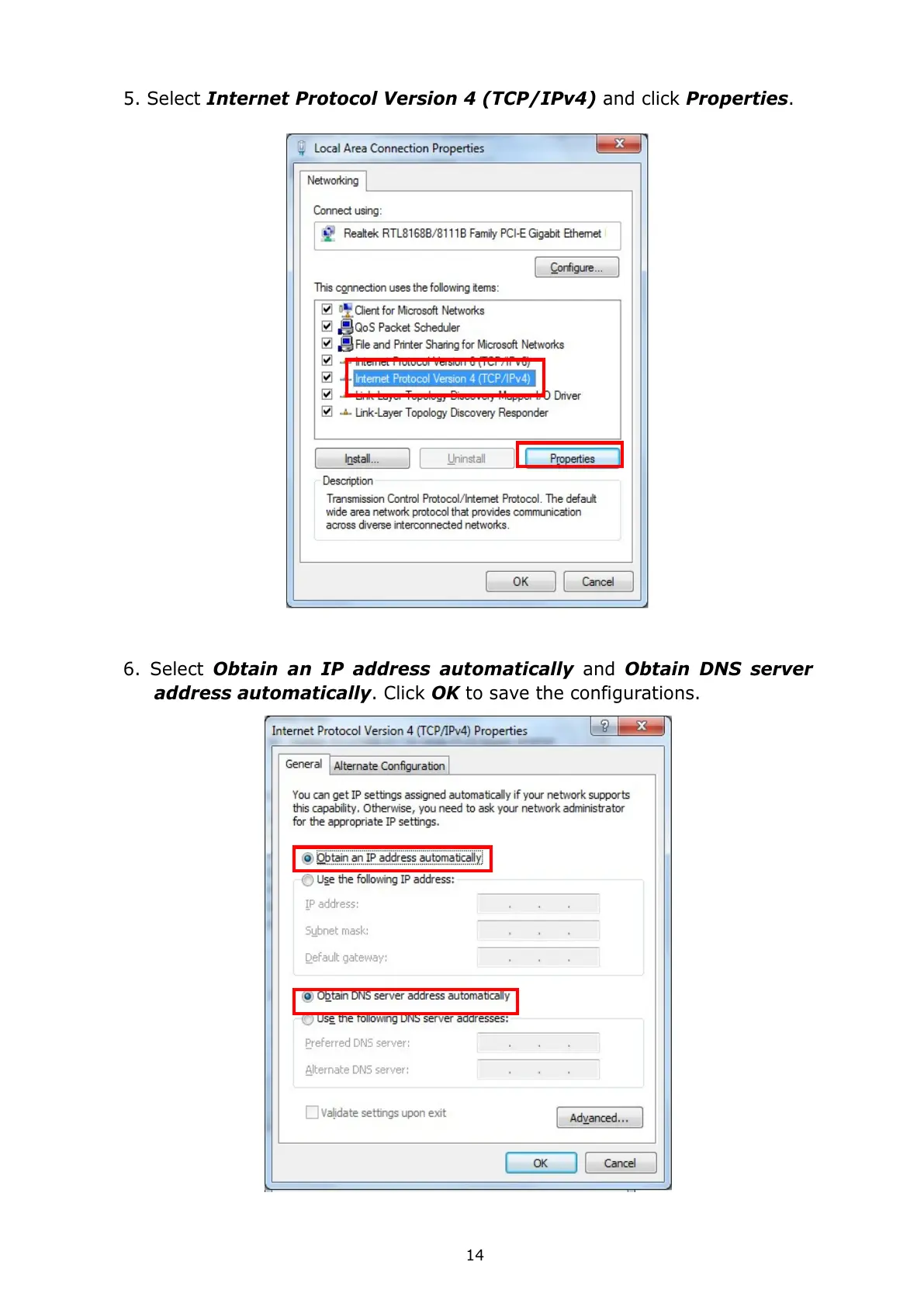 6. Select Obtain an IP address automatically and Obtain DNS server