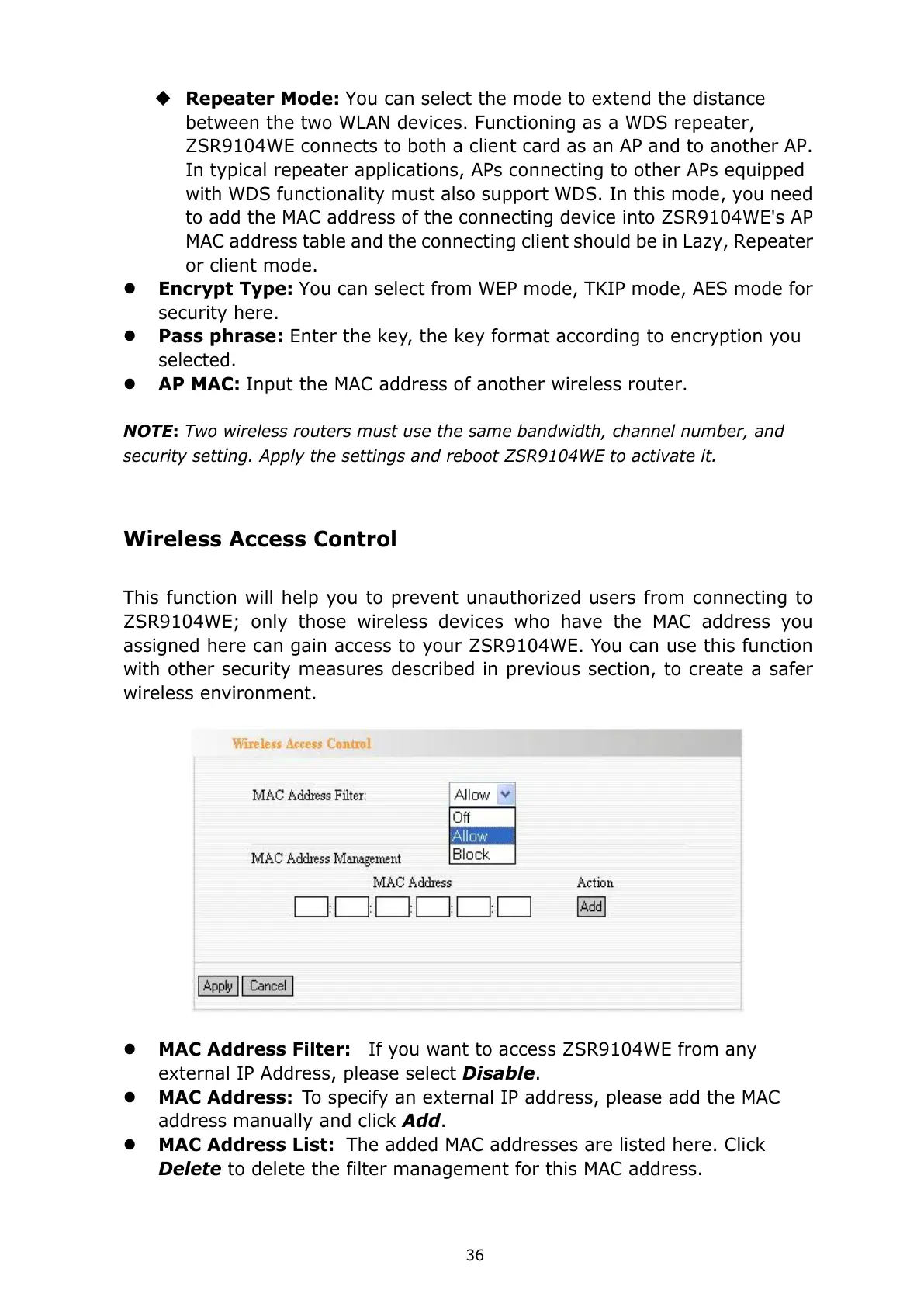 ZSR9104WE; only those wireless devices who have the MAC address you