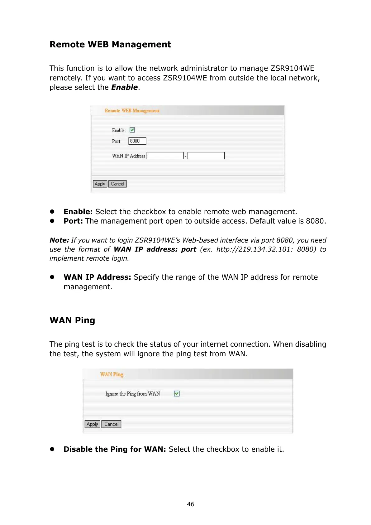 Note: If you want to login ZSR9104WE’s Web-based interface via port 8080, you need
