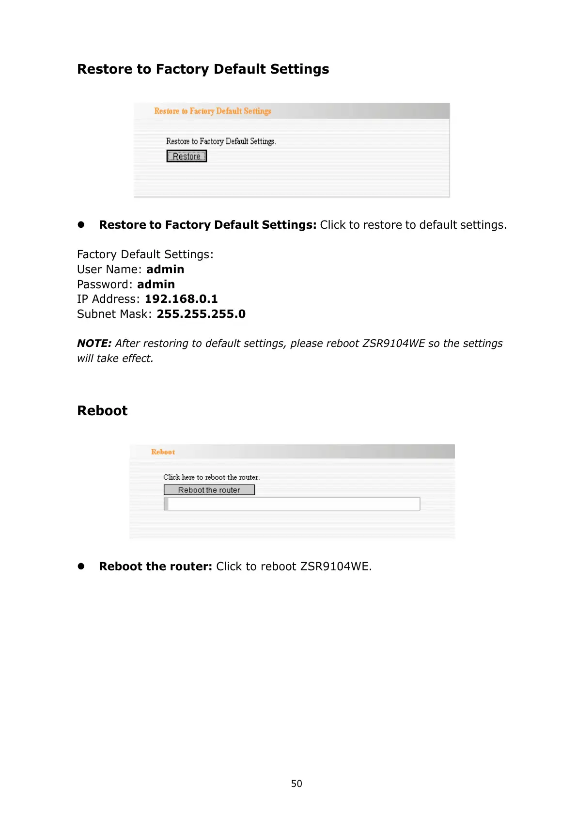 NOTE: After restoring to default settings, please reboot ZSR9104WE so the settings