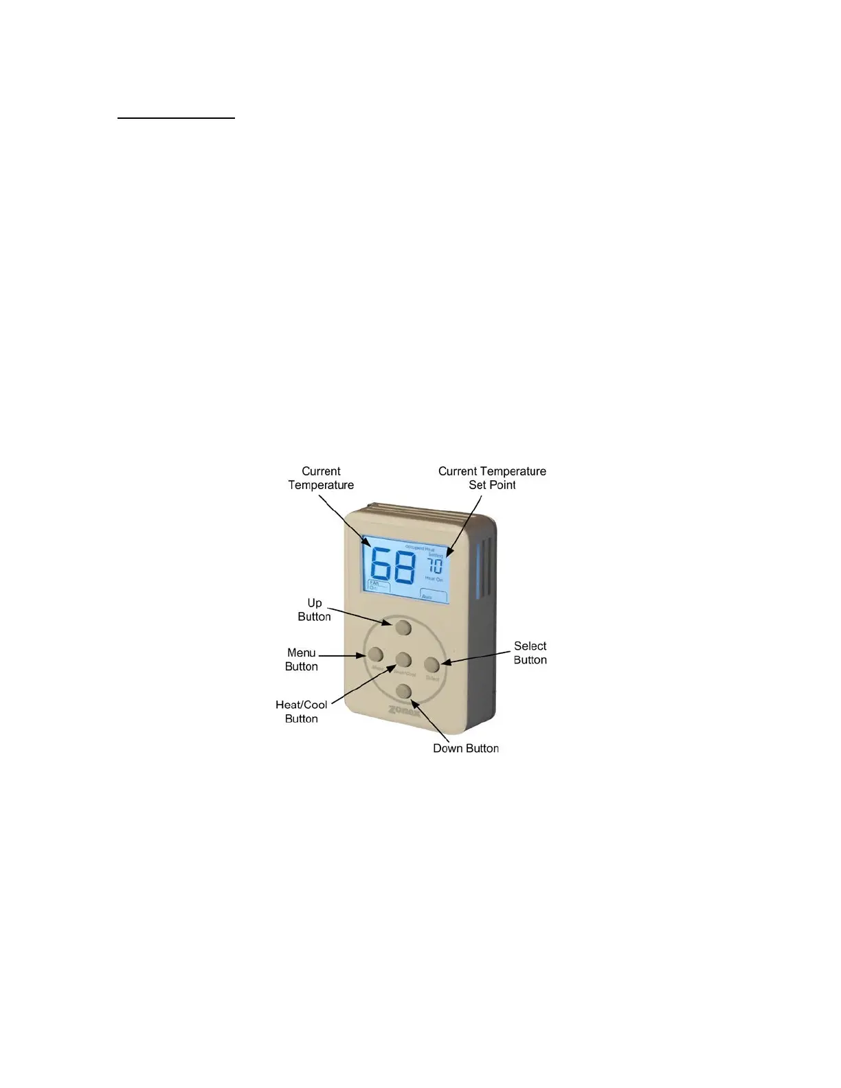The Heat or Cool set points can be displayed by pressing the Heat/Cool button; the set point will be