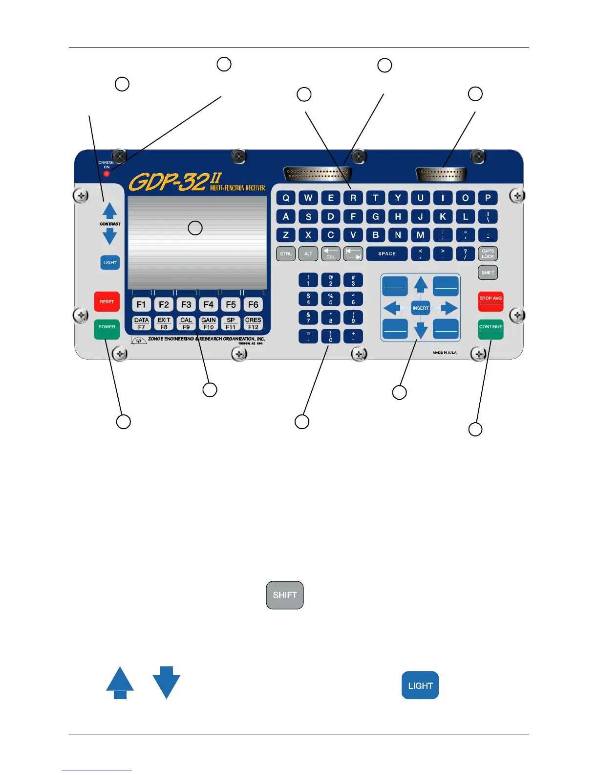 The front panel contains the display, keyboard, peripherals I/O and analog output port for the lid