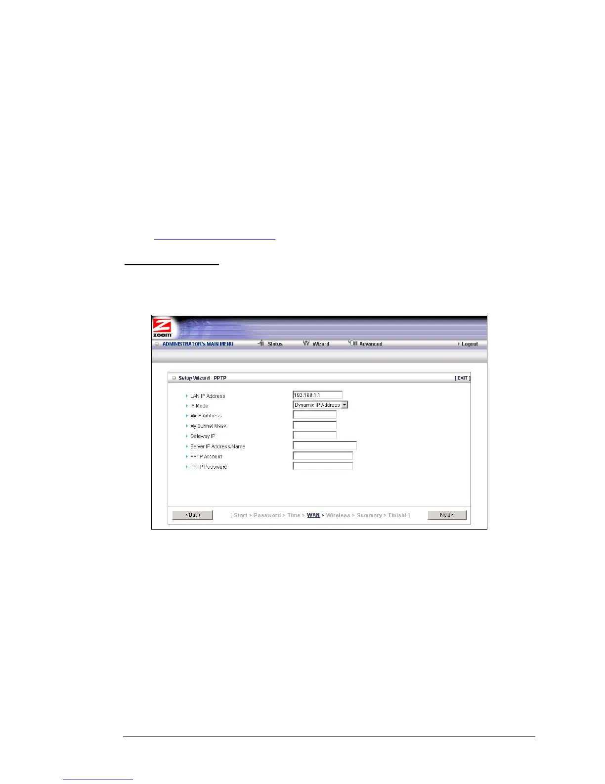 Tunneling Protocol (PPTP). When you select the PPTP button on the Select WAN Type