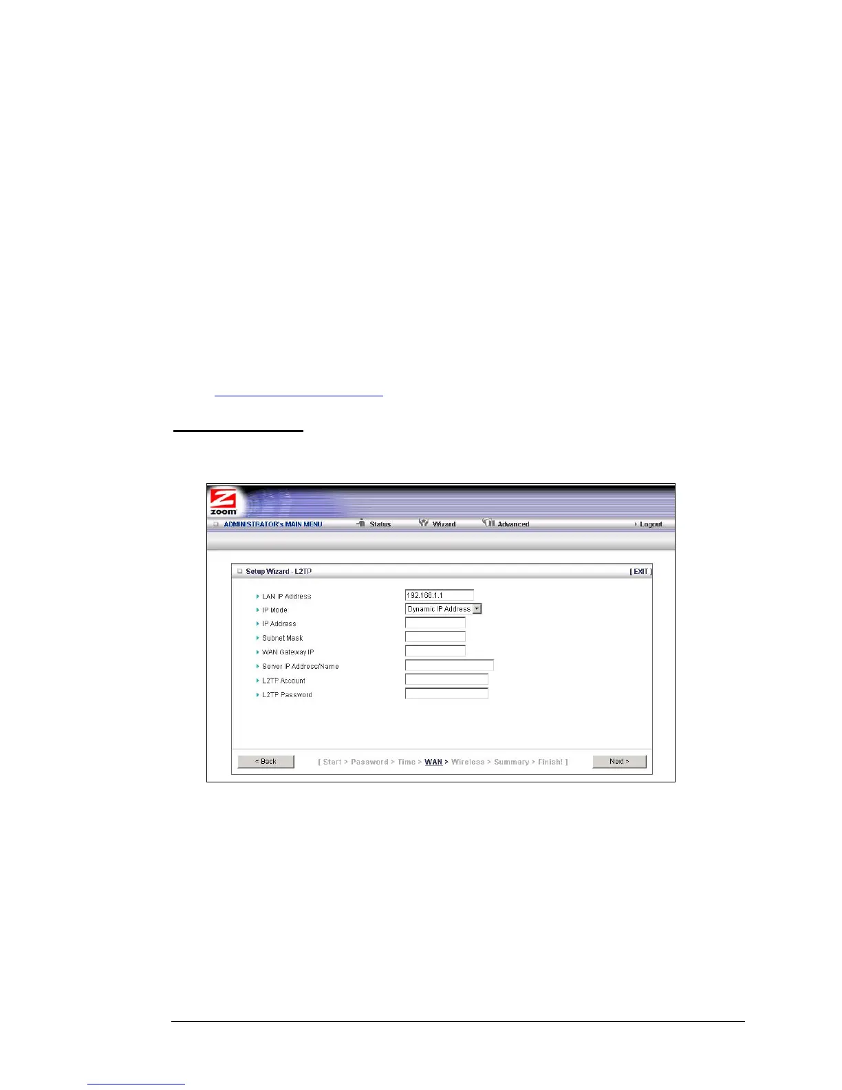 If you select the L2TP button on the Select WAN Type menu, the following page opens: