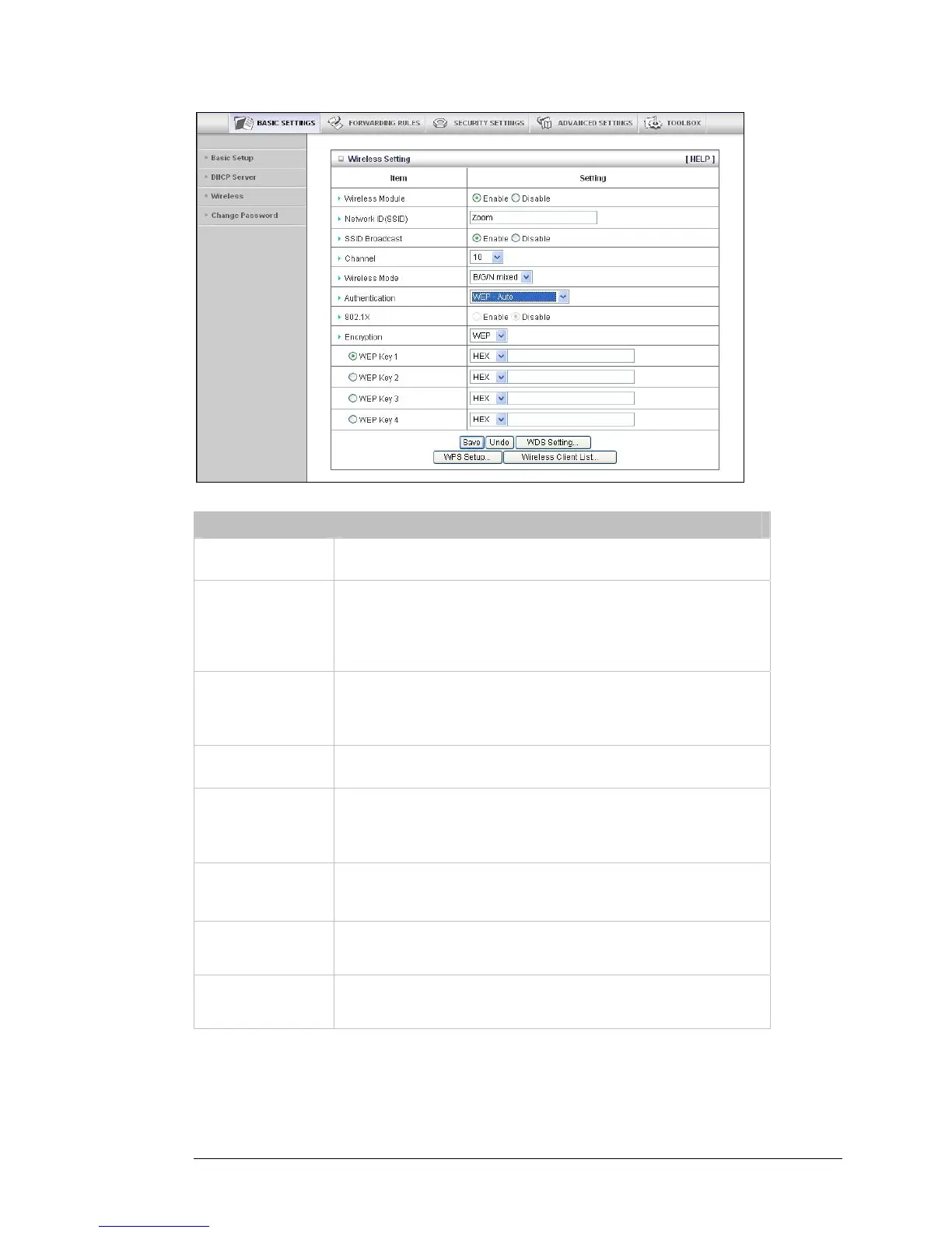 Authentication Accept the default, WEP-Auto or select one of the available options.