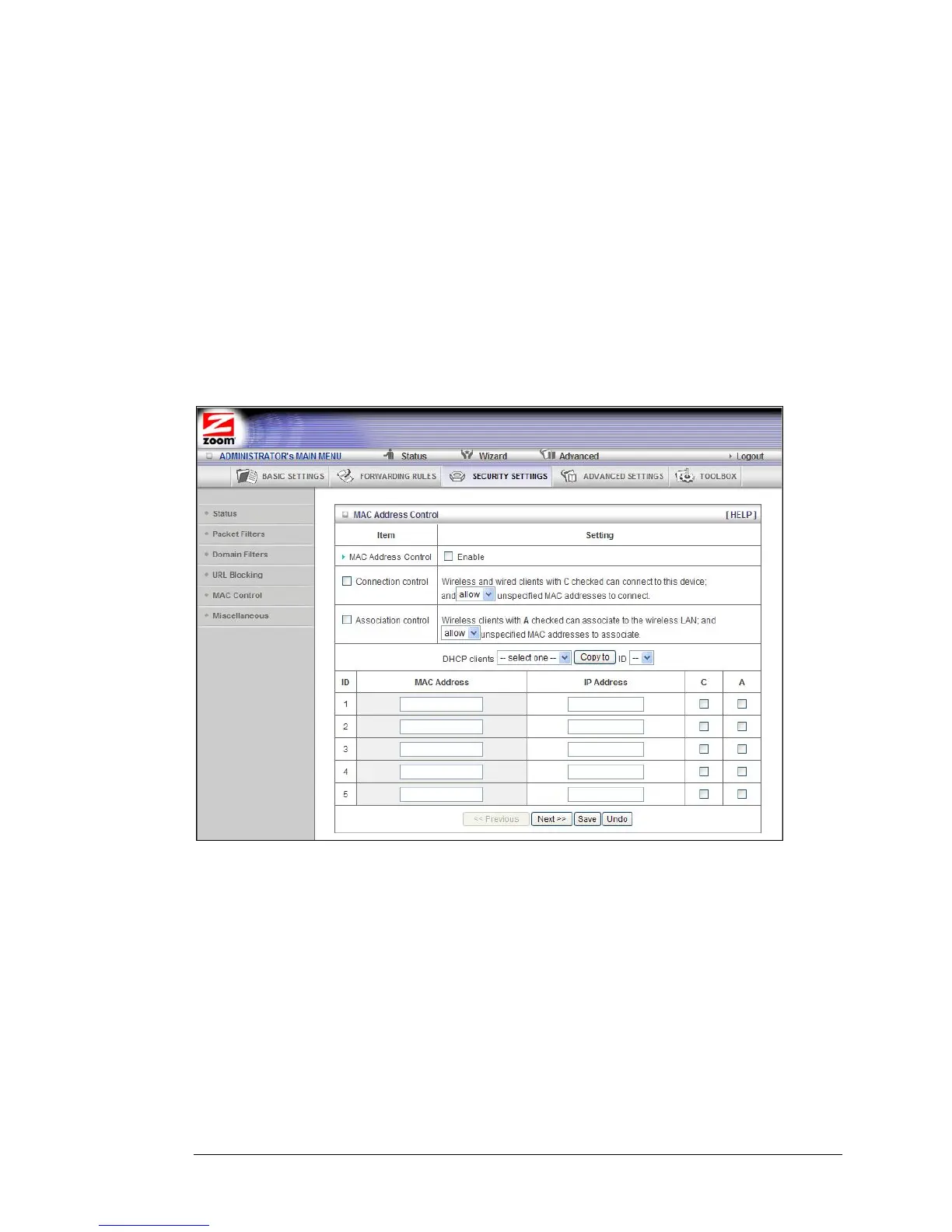 You can use the MAC Address Control page to enable MAC Address Control and to