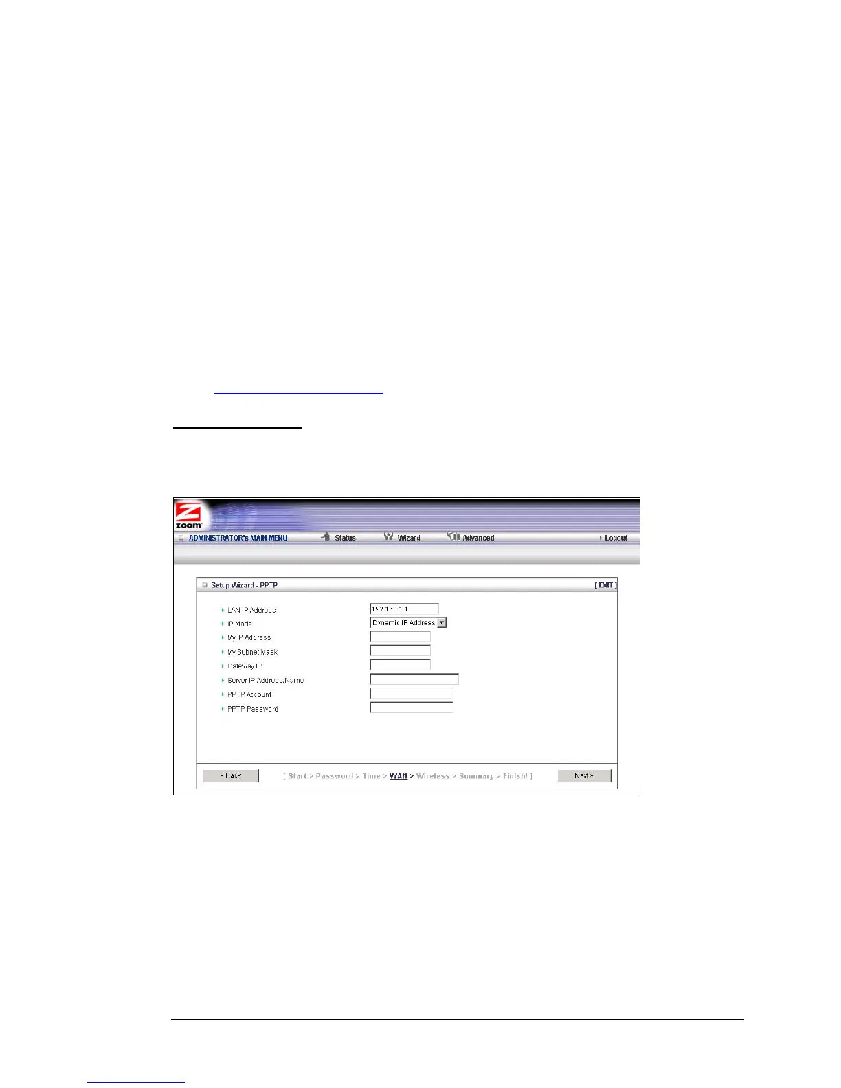 Tunneling Protocol (PPTP). When you select the PPTP button on the Select WAN Type