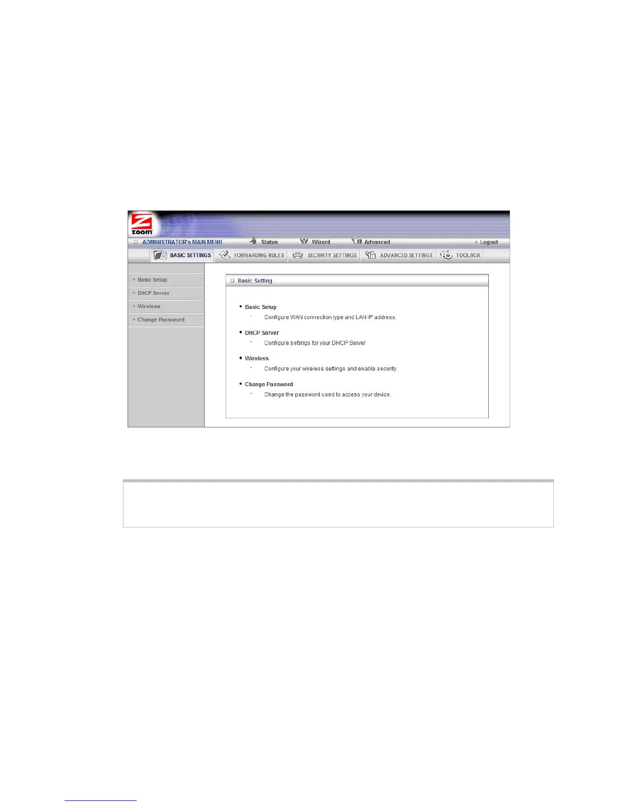 Forwarding Rules, Security Settings, Advanced Settings, or Toolbox).