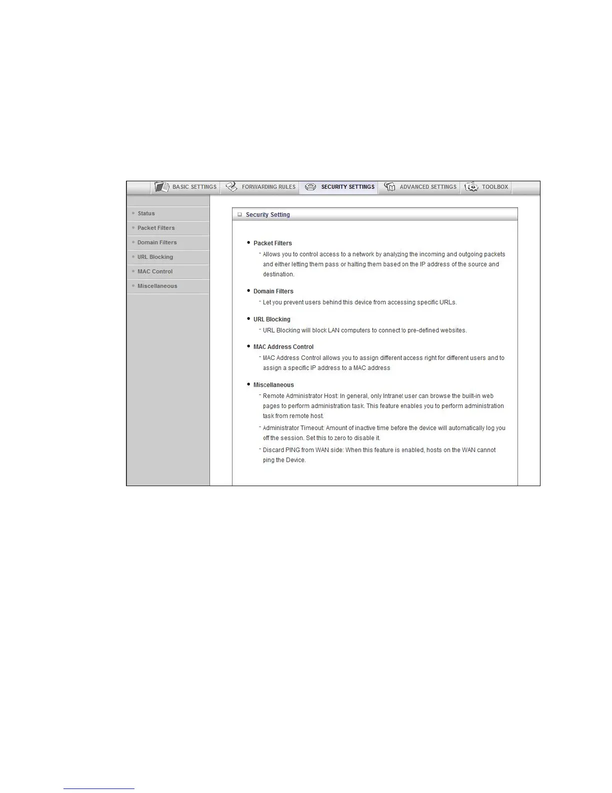 The Security Setting page lists six configuration menus on the left pane and provides a