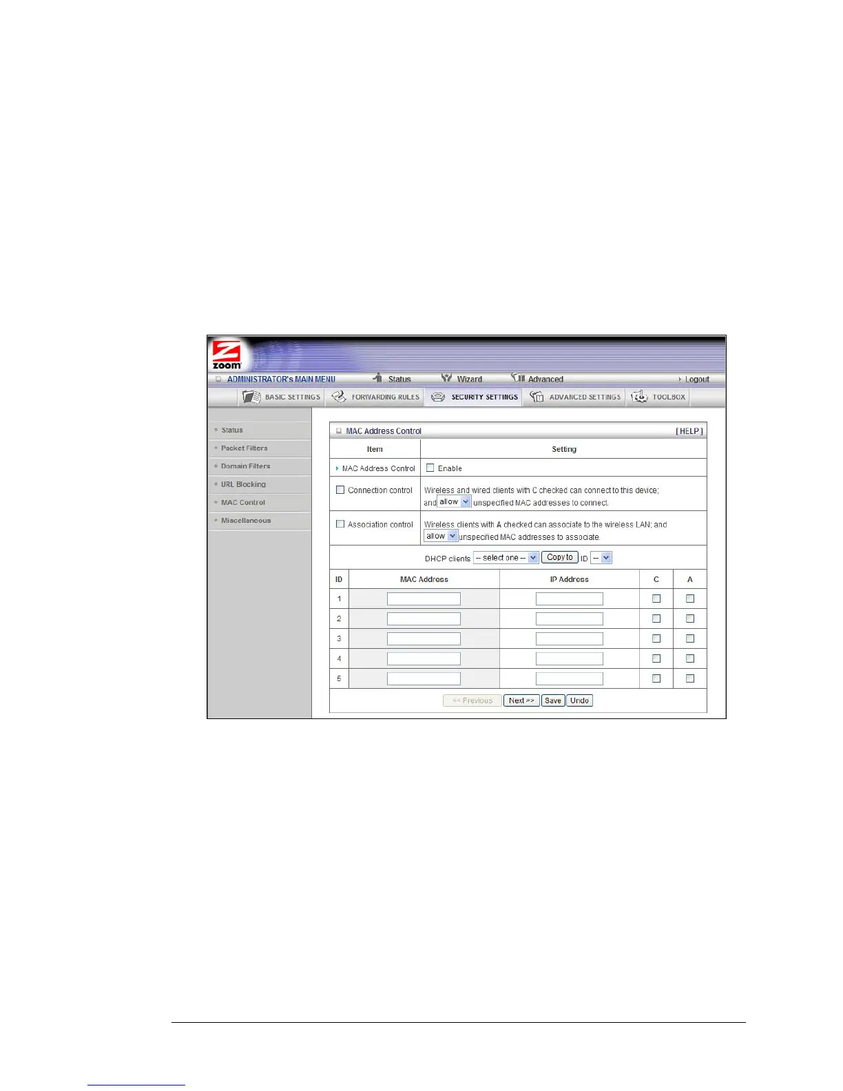 You can use the MAC Address Control page to enable MAC Address control and to