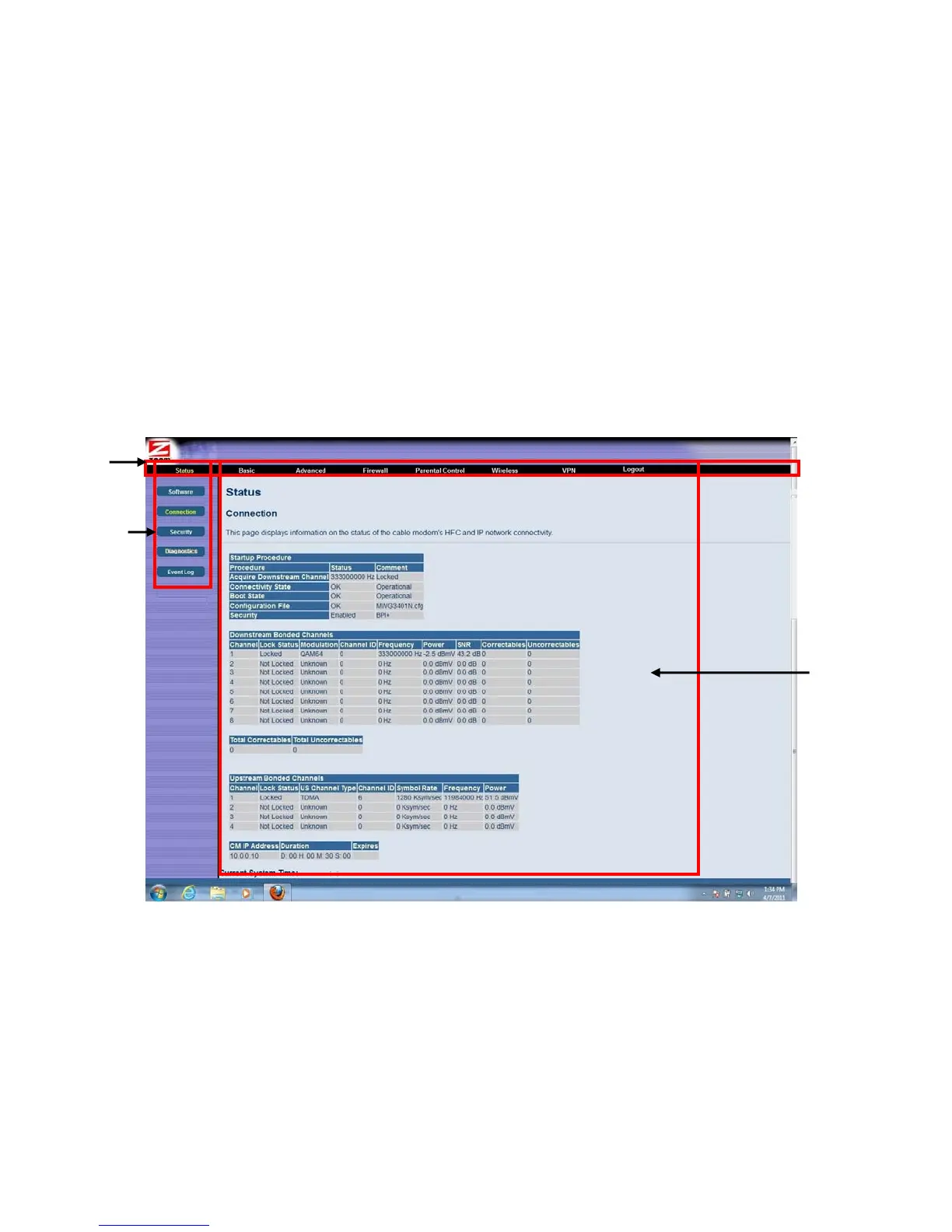 connection status information about your cable modem/router.