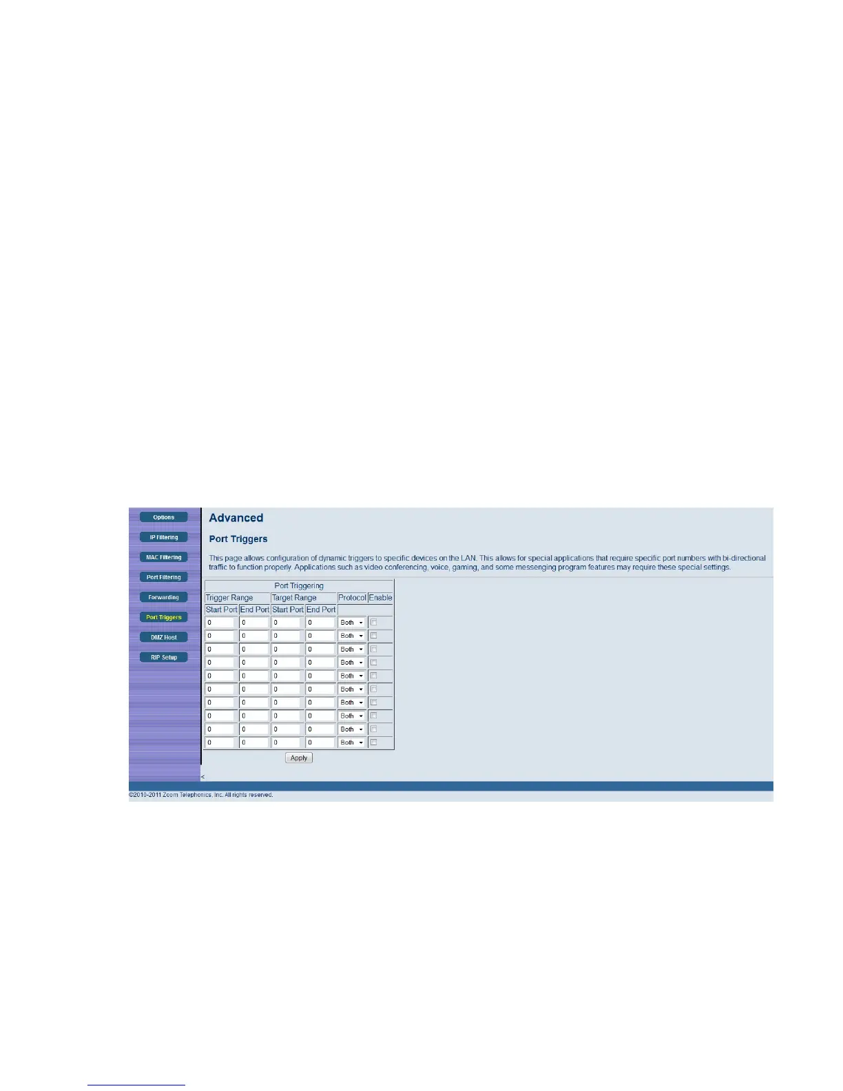 The Port Triggers page allows you to configure dynamic triggers to specific devices on the LAN. This
