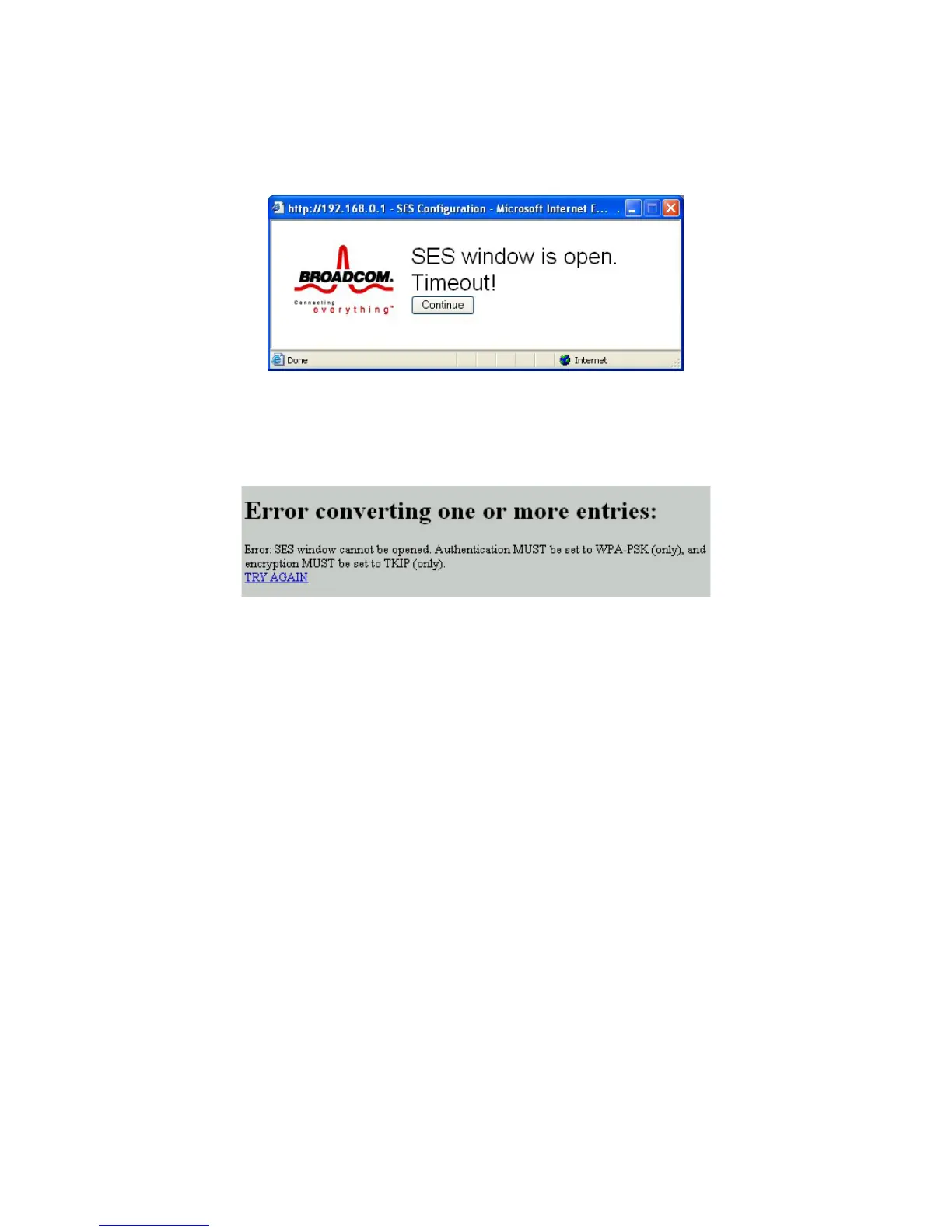 authentication with TKIP, the window will not open and the error message shown below will be