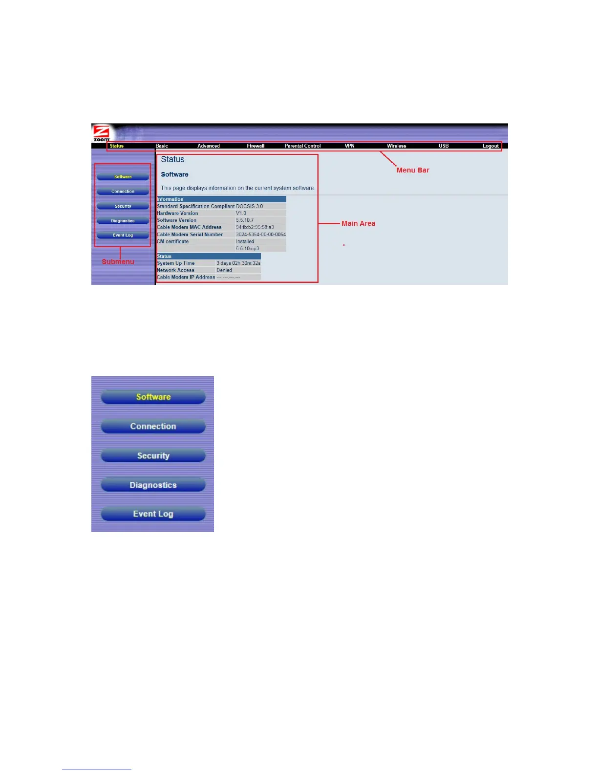 Status menu item, the submenu Software, Connection, Security, Diagnostics, and