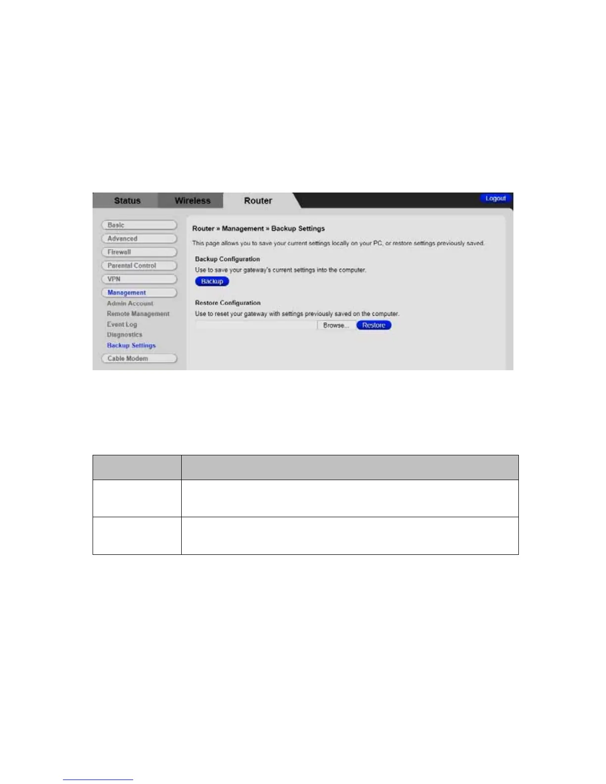 Click the Backup button to save your Cable Modem/Router’s current