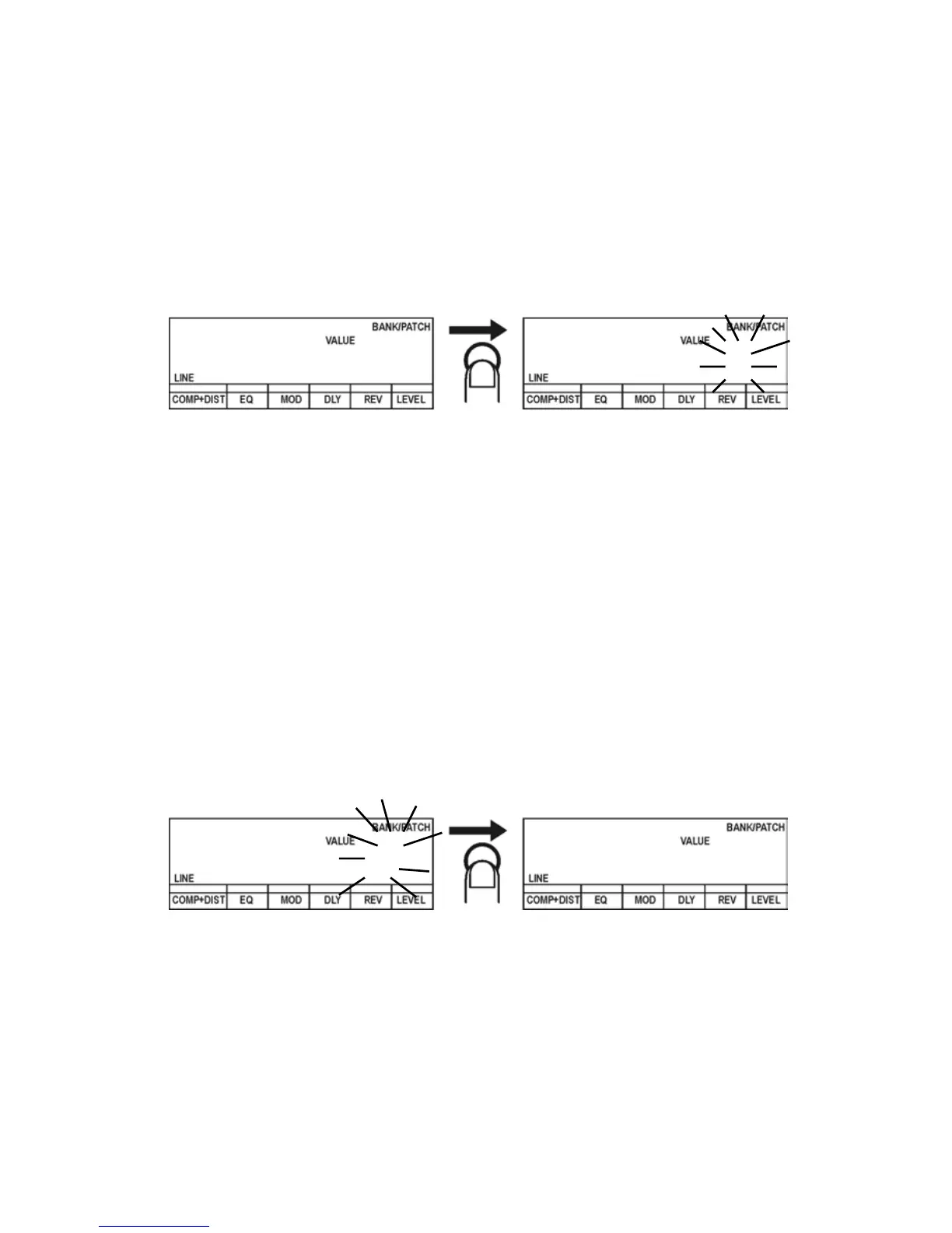 Only pressing the BANK DOWN/UP key(s) will not change the sound of the effect. The