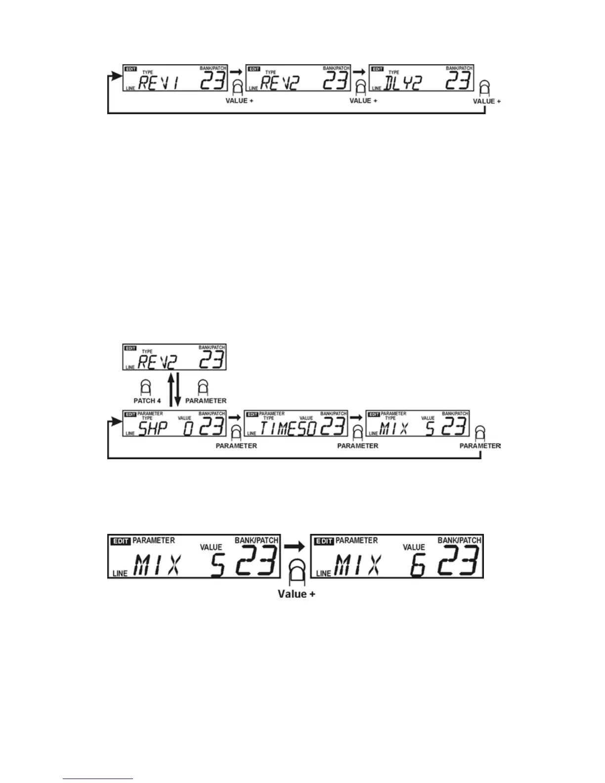 VALUE - / + key(s) changes the Effect Type as shown in the following figure.