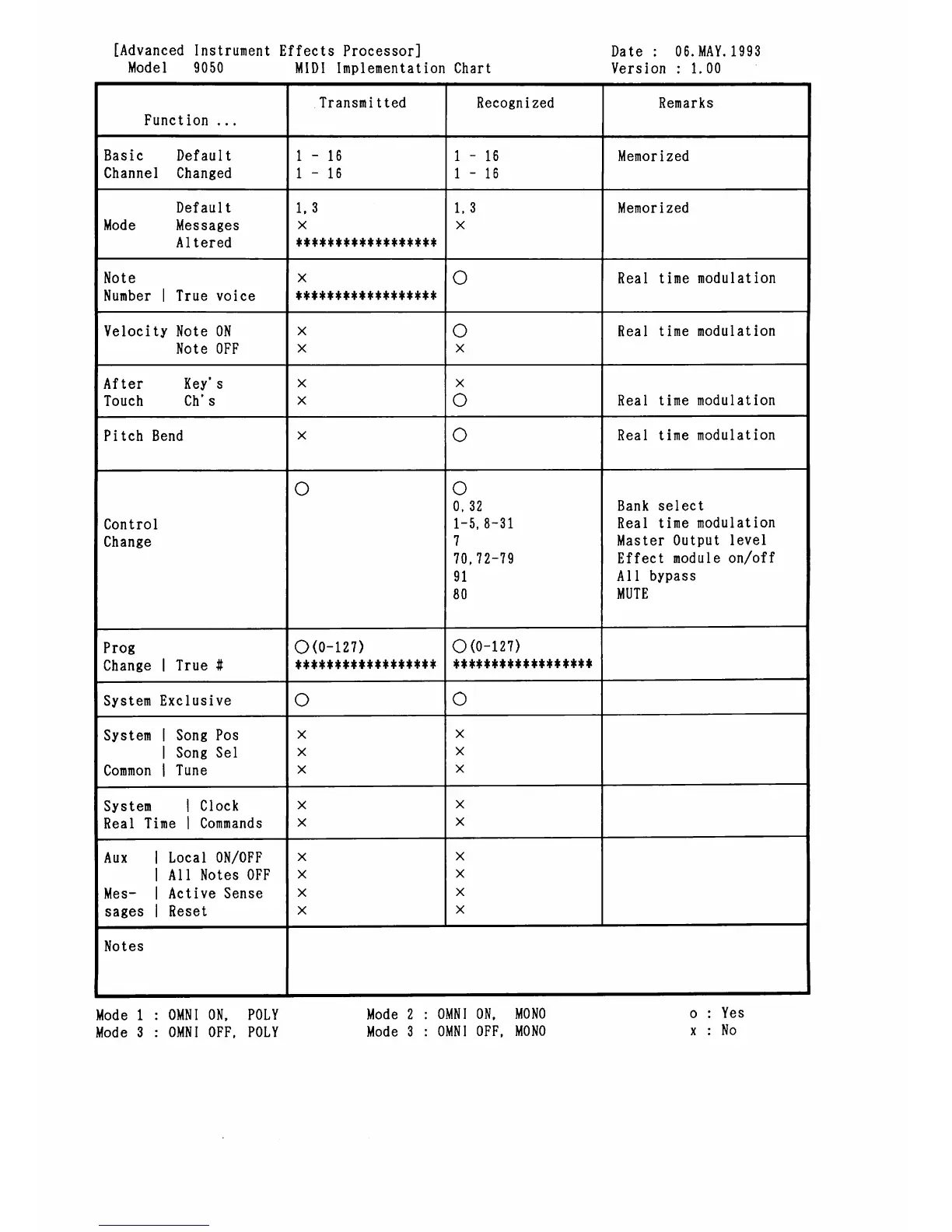 MIDI Implementation Chart