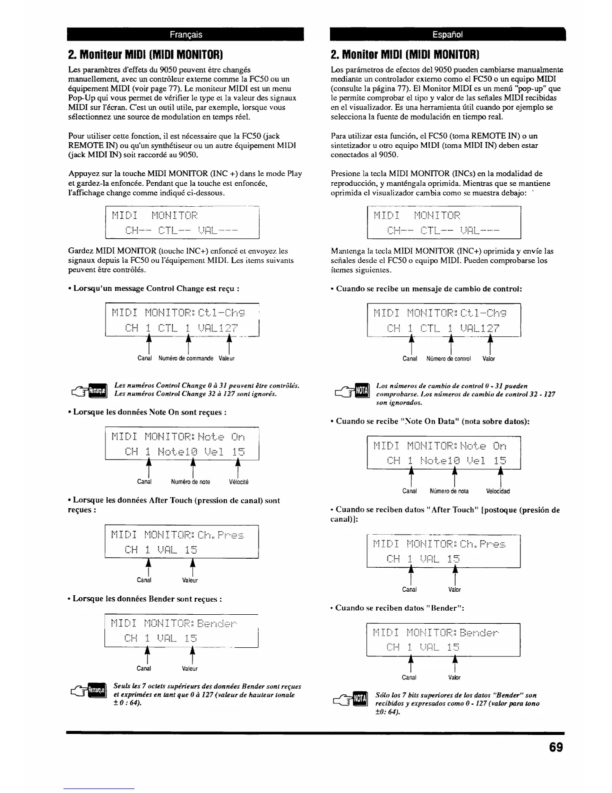 signaux depuis la FC50 ou 1'Cquipemcnt MIDI. Les items suivanls